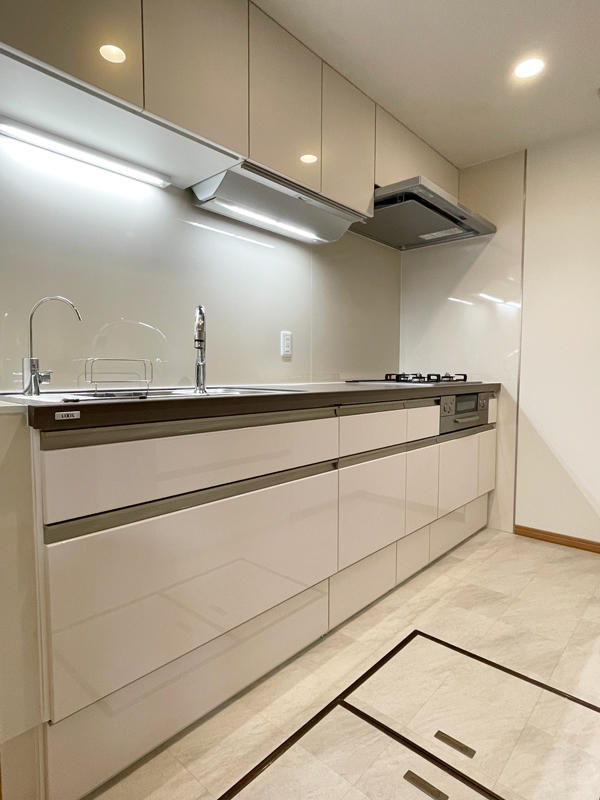 LIXIL リシェルSI W2400にお取替え。扉面材は光沢のある「グレイスフルホワイト」をお選び頂きました。吊戸にはクイックポケットを設置。引出しを開け閉めしなくても調味料などの出し入れができるので、調理のリズムをくずさず快適に調理できます。