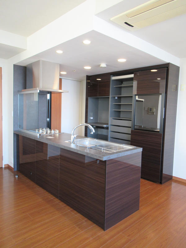 LIXIL リシェルSIにお取替え。ペニンシュラI型キッチンW2574とW450の収納ユニットの組み合わせです。扉色は光沢が美しい「ダークレオ」、ワークトップはセラミックカウンターで「グレーズグレー」色をお選び頂きました。