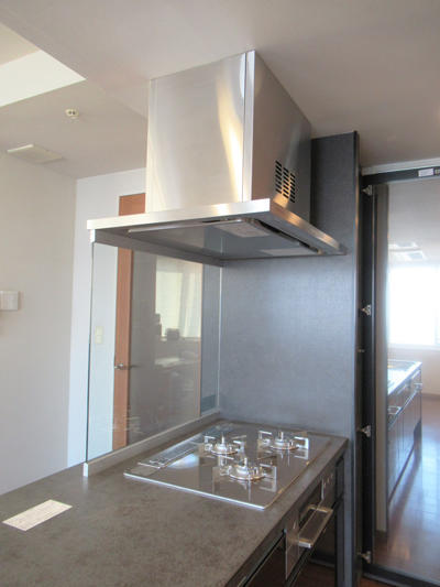レンジフードはW900の同時給排タイプのセンターフード。スタイリッシュですっきりとしたデザインです。ステンレス製で普段のお手入れはカンタン!拭き掃除だけでオイルトレーは油をサッと拭き取って洗うだけでOKです。