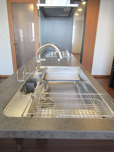 シンクは【ひろびろWサポートシンク】。シンクの両側にプレートや水切りカゴを置いても、十分なスペースを確保。調理中の洗い物などの作業も後片付けも並行作業でラクラク♪スムーズに行えます。水栓はハンズフリー水栓で吐水口に内蔵されたセンサーが物や手の位置と動きを感知して、吐水も止水も自動で行います。シンク作業がラクになって、節水もできる水栓です。