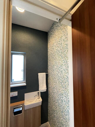 トイレは「サティスS」の手洗い付きタイプをお選びいただきました。コンパクトなサイズが叶える空間の広がり、漆喰のような優しい表情を持つ青い壁紙と木材のコントラストは「サティスS」の美しさをより引き出し調和します。便座に座った際に目に入る植物のアクセントクロスがポイントです。薄型の手洗器ですがトイレ用品をしまう収納力もあるので安心です。
