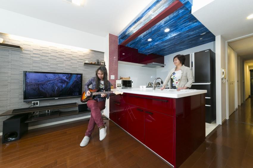 元々は吊り戸棚がある、カウンターキッチンでした。キッチン自体はまだまだ使用できたため、当初はリフォームの予定はありませんでした。しかし、冷蔵庫とコンロの位置関係などを見れば、料理をするのもストレスが掛かると判明。そこで、L型にして奥にコンロ、手前に冷蔵庫を配置。さらにカウンター下収納をしつらえることでリビング空間もスッキリと広く使えることができました。キッチンのシックで落ち着いた赤色に合わせて壁のタイルも赤に。そして天井は遊ばせて頂きました。木質感のある青色のクロスを貼り見ているだけで楽しそうな空間になりました
