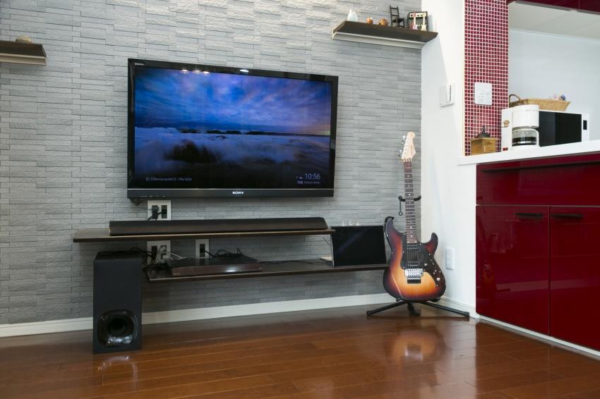 TVを壁付けに、広くなったリビングAVシステム。夫婦でゆっくりと映画を觀たり、ミュージックビデオを楽しむことも多いN様。もともとは一般的なAVラックにレコーダーやスピーカーを設置しておられました。今回はリビング壁面に間接照明+エコカラットを設えて、そこにTVモニターを壁付けで設置しました。また、ラックも壁面に造作したため、無駄なスペースがなくスッキリと収納できるため部屋の面積以上に広くお部屋を使うことが可能になりました。