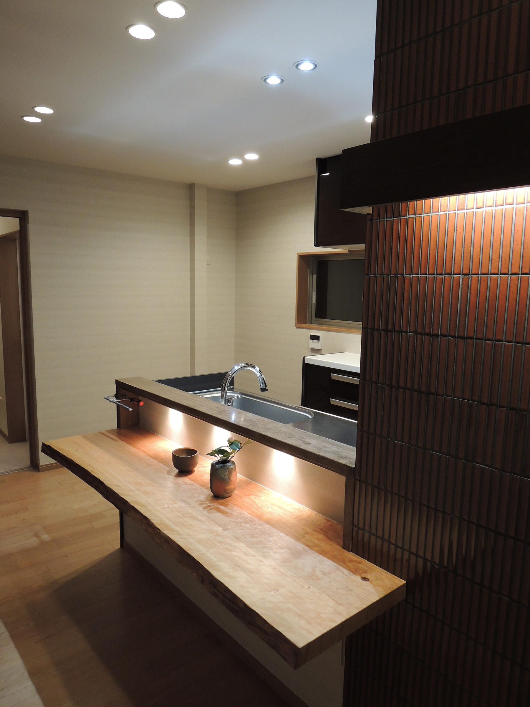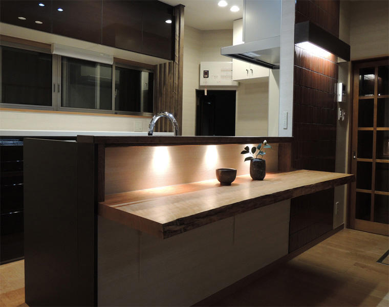 「キッチンカウンターに⽊を使いたい」というご要望にお応えするため、無垢のブラックチェリーをご提案。ご主人お気に⼊りの「備前焼」を飾るスペースを設け、照明を仕込みました。