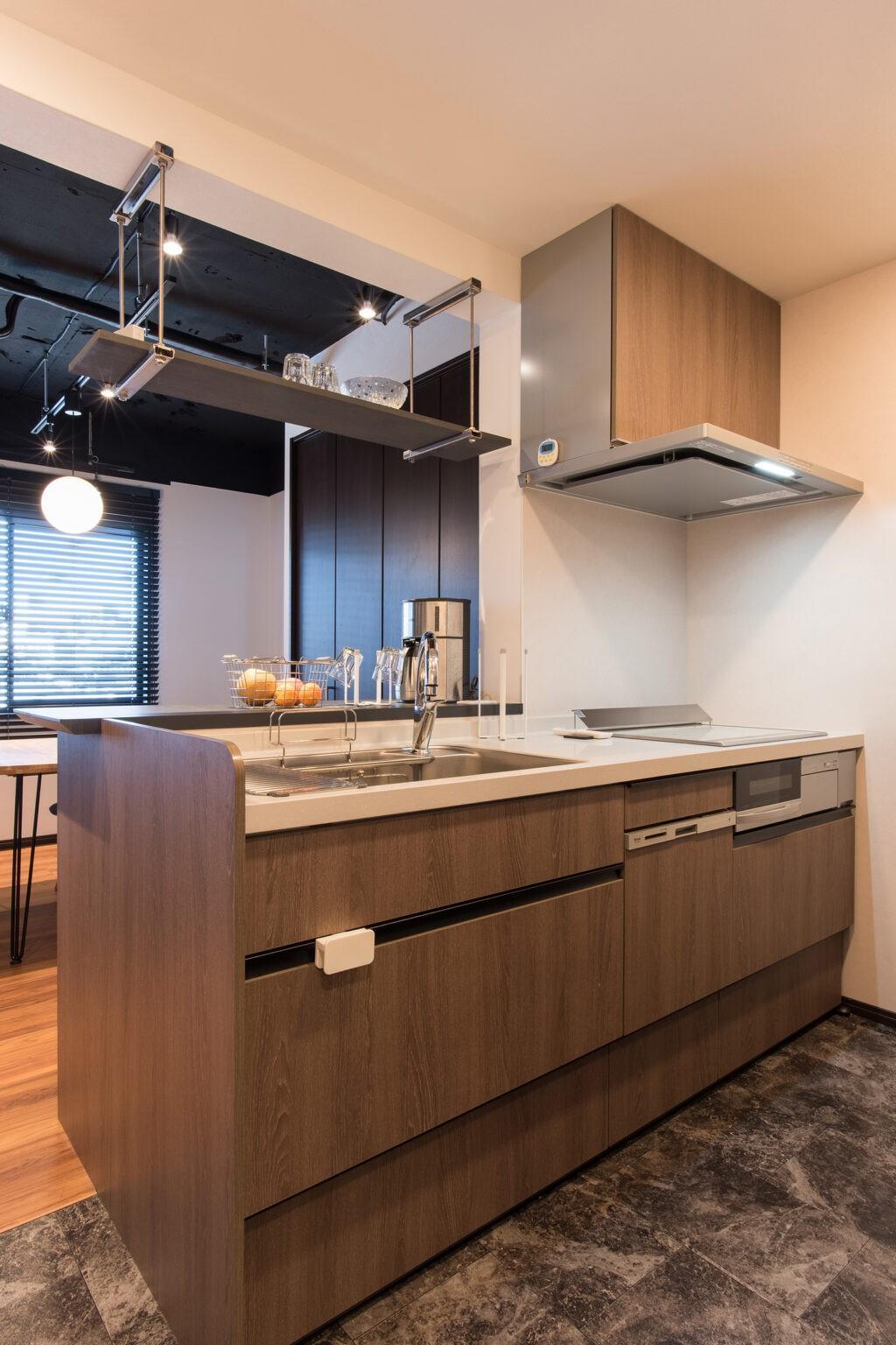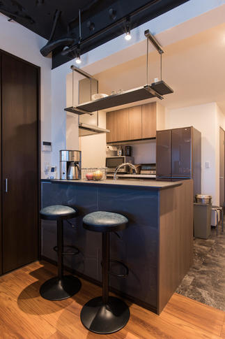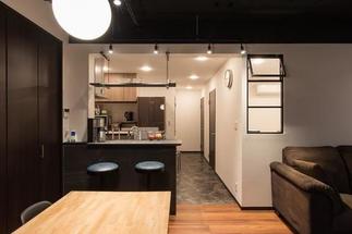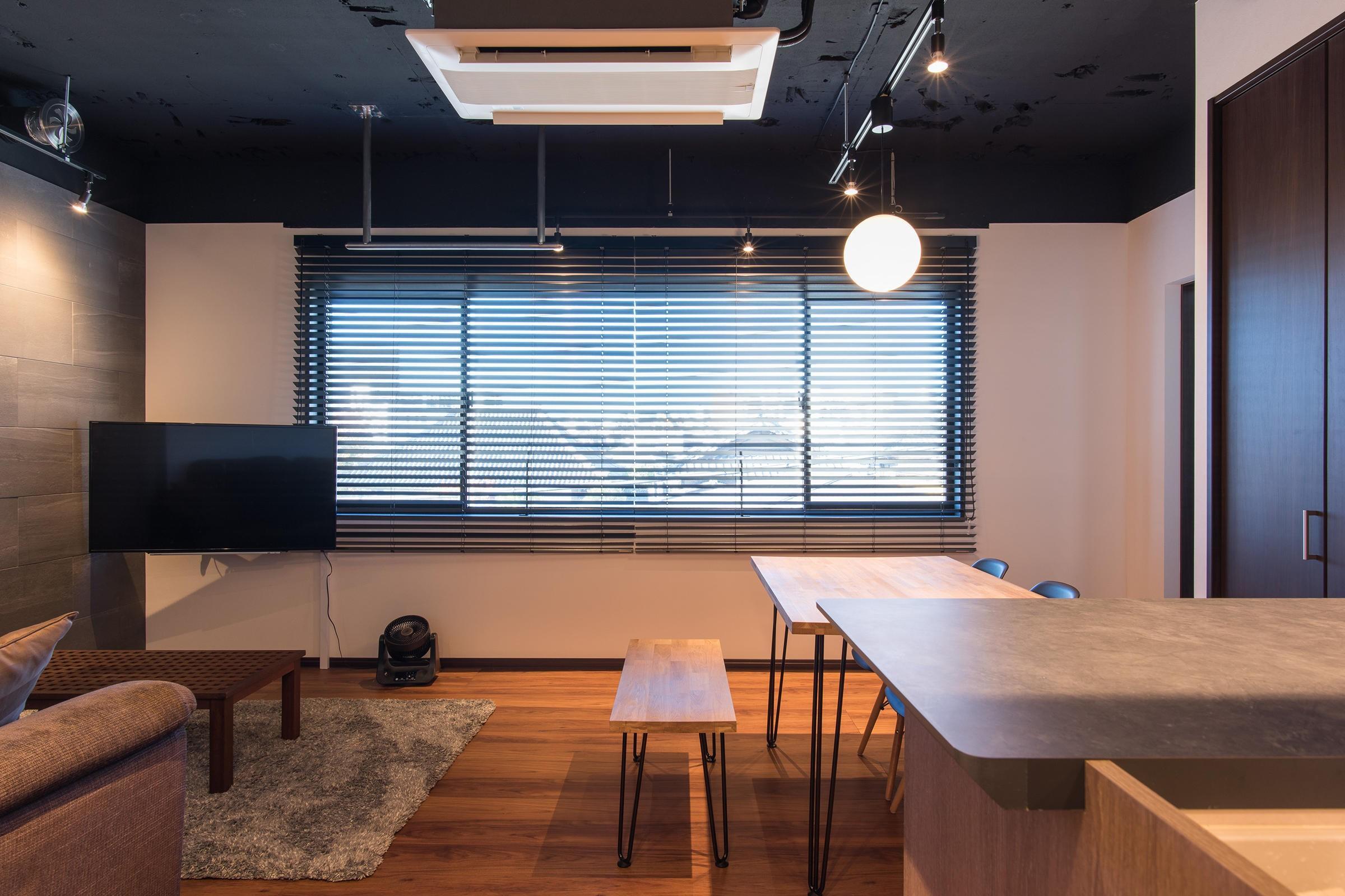 事務所として使っていたマンションを住居へとリノベーション。高い天井と白い壁、室内窓がカッコいい隠れ家BARのようなLDKになりました。