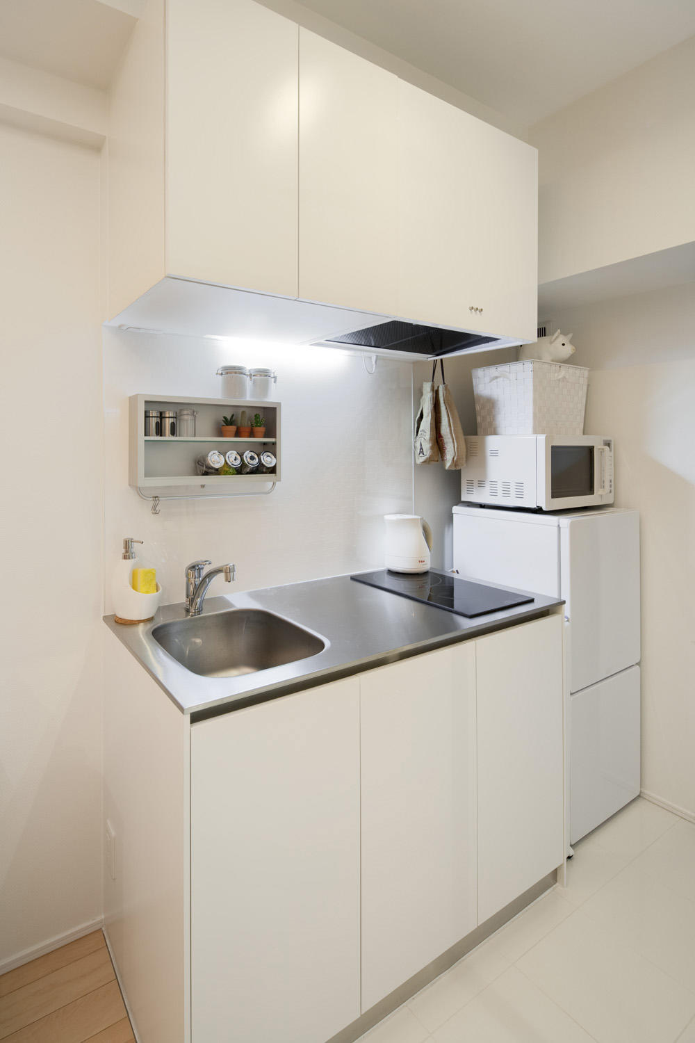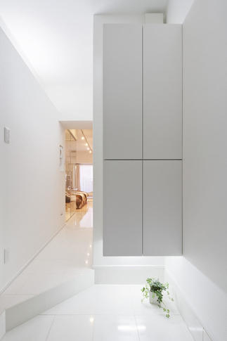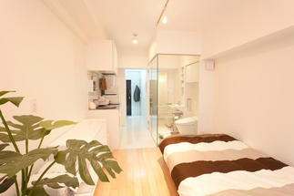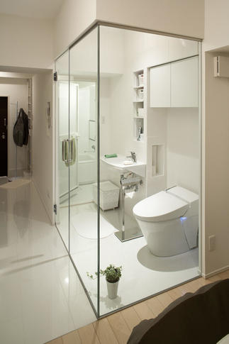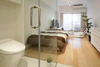 天井高を上げ、壁も出来るだけ薄くし、空間を可能な限り拡大したことで、ワンルーム空間がひとまわり大きくなりました。さらに、水回りをガラス張りにしたことで、開放的な住空間に。