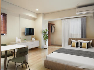 海外暮らしのオーナー様が日本に戻って来た時に使うワンルームマンション。滞在型ホテルのようなシンプルで使い勝手がよく、ちょっとおしゃれな空間に仕上げました。
