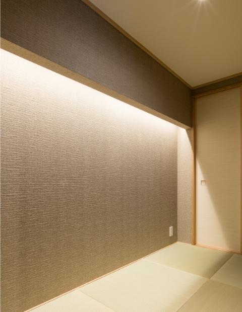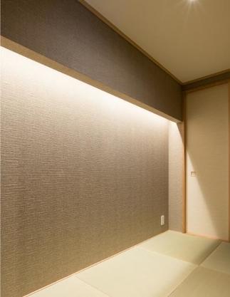畳スペースの壁面に配した間接照明。夜、間接照明だけを灯すと、雰囲気のある空間に。壁紙は貼るのがとても難しい布クロス。貼れる職人さんも少なく、腕の良い職人さんに無理を言って来ていただきました。