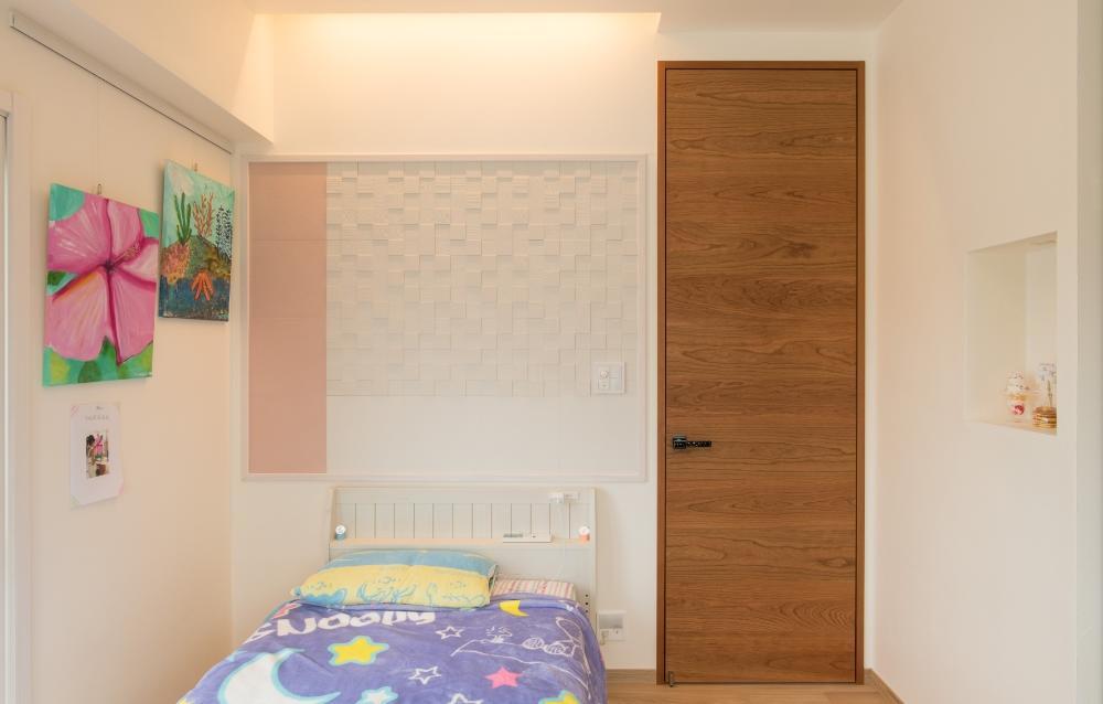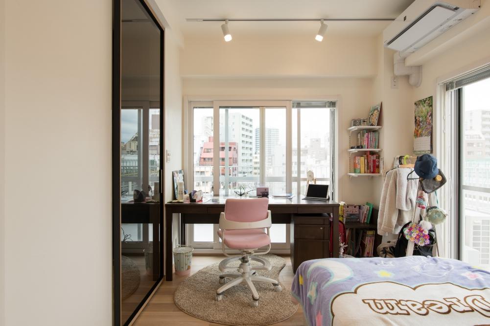約8畳の古い和室を、子ども部屋にリノベーション。天井高を約20cm高くすることで、圧迫感のない開放的な空間に。壁は白の漆喰、照明はダウンライト、アクセントとして間接照明を配し、窓枠も白で統一。ホワイトベースの女の子らしいオシャレでかわいいお部屋となりました。
