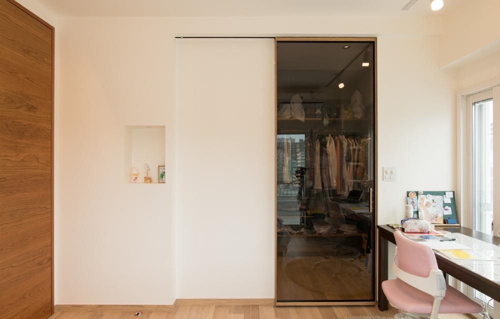 洋服好きな娘さんのための大容量ウォークインクローゼット。ドアは、ショールームで一目惚れしたガラスドア。天井のスライド部分で支え、ドアが宙に浮いているため、娘さんでも楽に開閉できるようになっています。白い漆喰の壁に配された飾り棚は、空間のアクセントになっています。