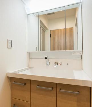 明るく清潔感のある洗面所になりました。洗面化粧室が狭いスペースになってしまう場合は、明るめの色を使うと、広く感じるようになります。