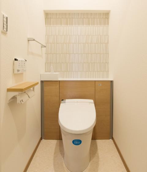 背面に掃除道具などをしまえる収納があります。背面壁にアクセントクロス。これだけでトイレの雰囲気が変わります。