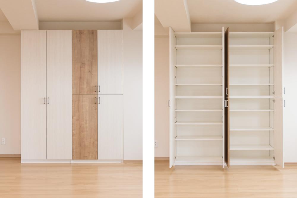 扉の一部だけを木目調にした収納棚。程よいアクセントになっています。可動棚になっているので、収納するものにあわせて高さを変えられます。