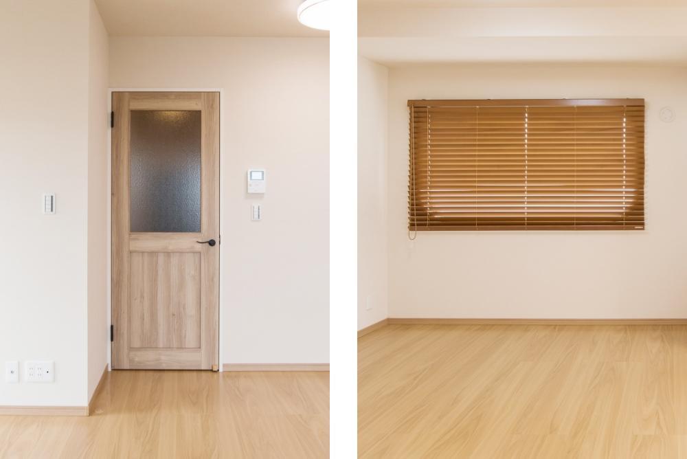 全体のインテリアに合わせたドアを採用しました。窓にはウッドブラインドを設置しています。