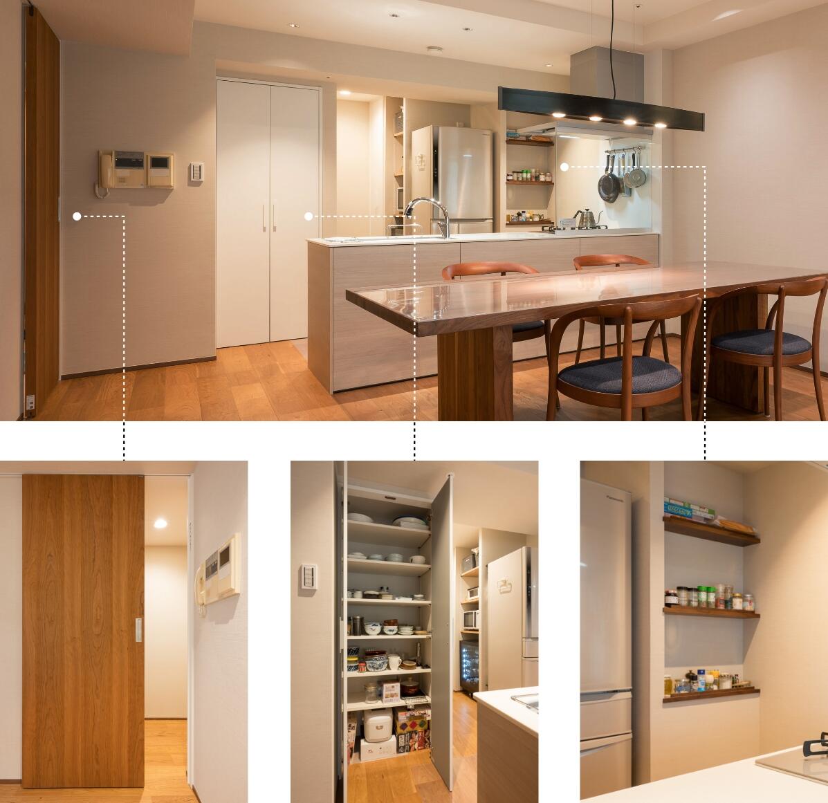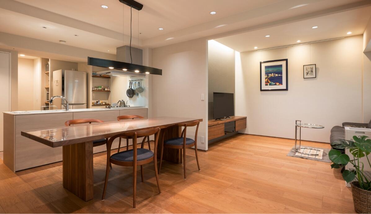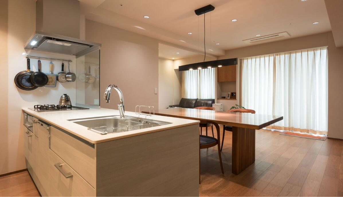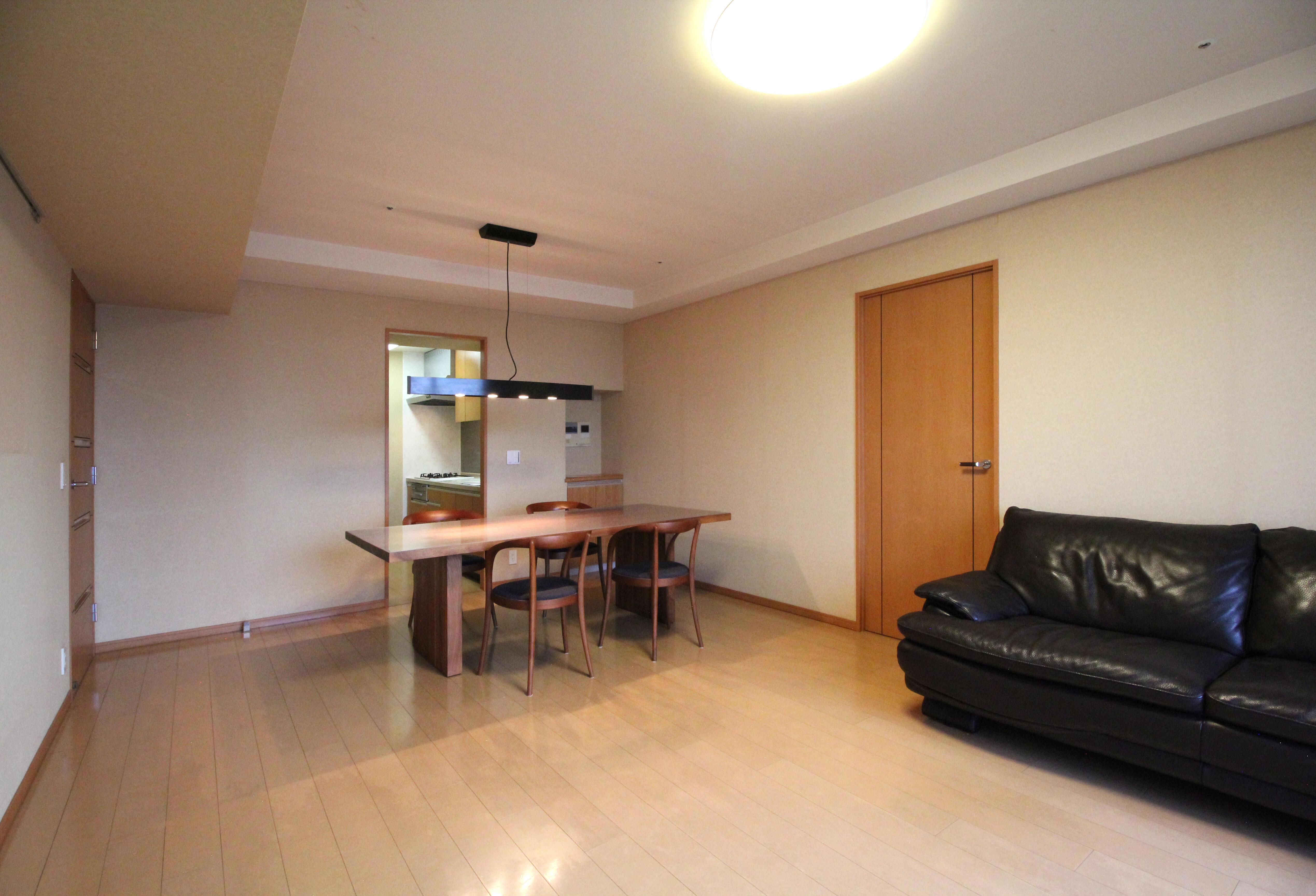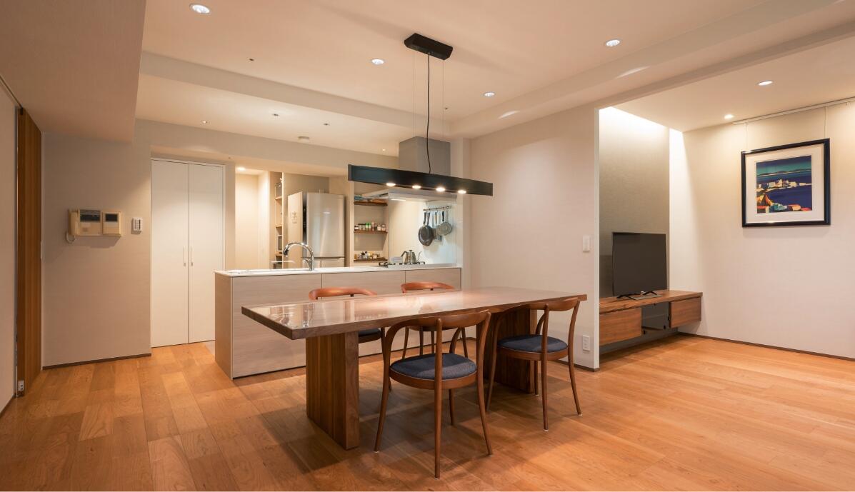 施主様お気に入りのダイニングテーブルやペンダントライトを活かす空間デザインを心掛けました。ダイニングテーブルの無垢材の色と床材や建具の色のバランスを考慮。全体的に色数は少なめでまとめました。