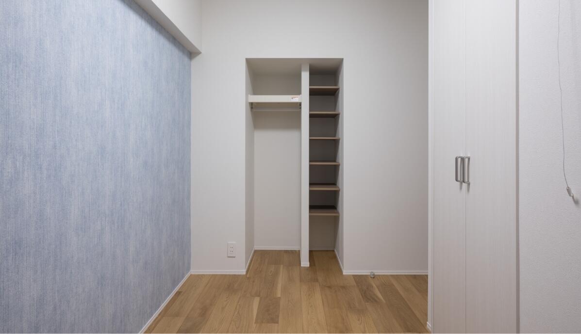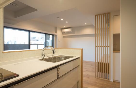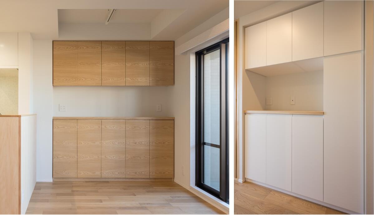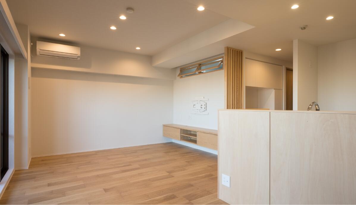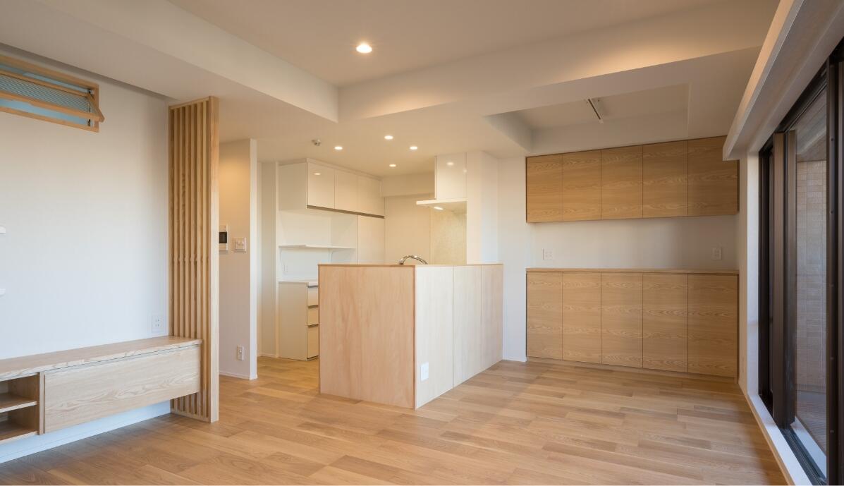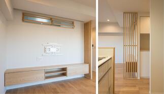 床材は裸足で過ごしたくなる天然木。格子や造作家具も天然木を使用。優しくあたたかみのあるナチュラルモダンテイストのインテリアに仕上げました。心地よい空間を維持するため、使いやすい収納をそこかしこに設け、片づけしやすい住まいを実現しました。