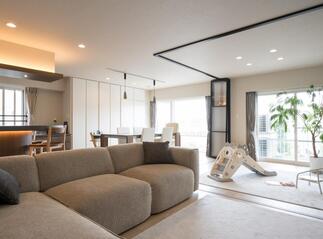上質なインテリアで、まるでホテルのような落ち着きを感じられる空間を目指しました。室内は、随所に大容量の収納を設けることで、すっきりと美しく保てる設計に。さらに、小さなお子さまと一緒に快適に暮らせるよう、動線や間取りにも工夫を凝らしています。心安らぐ居心地のよさと、子育てのしやすさを両立した、理想のリノベーションを実現しました。