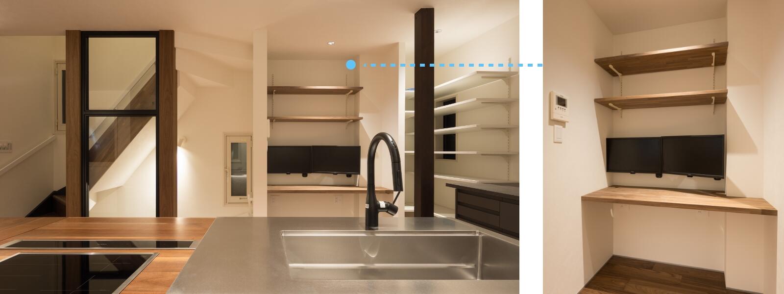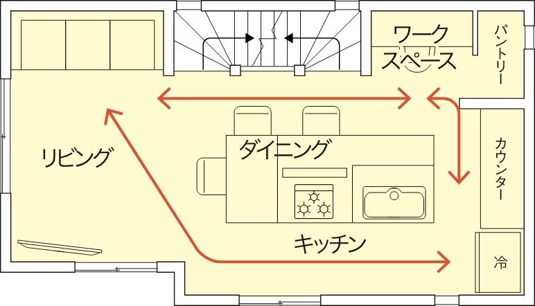 小さなお子さまのいるご家庭で、家事も在宅ワークも心地よくこなせるよう、2階にLDKとワークスペースを集約。仕切りのないワンフロアと回遊性のある動線によって、どこにいてもお互いを感じながら過ごせるここちいい暮らしが実現しています。限られた面積の中でも、家族がゆったり過ごせる工夫が詰まった事例です。