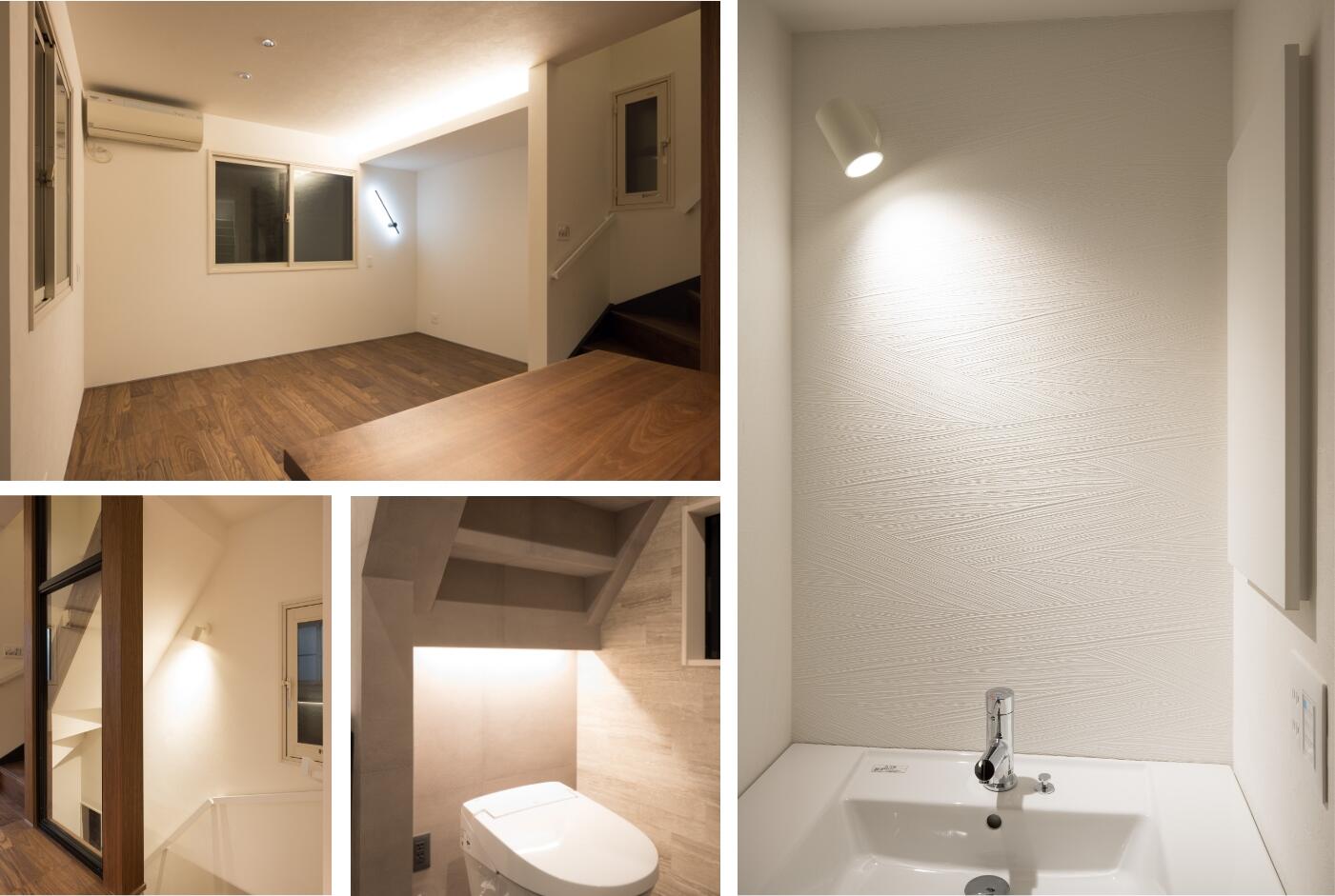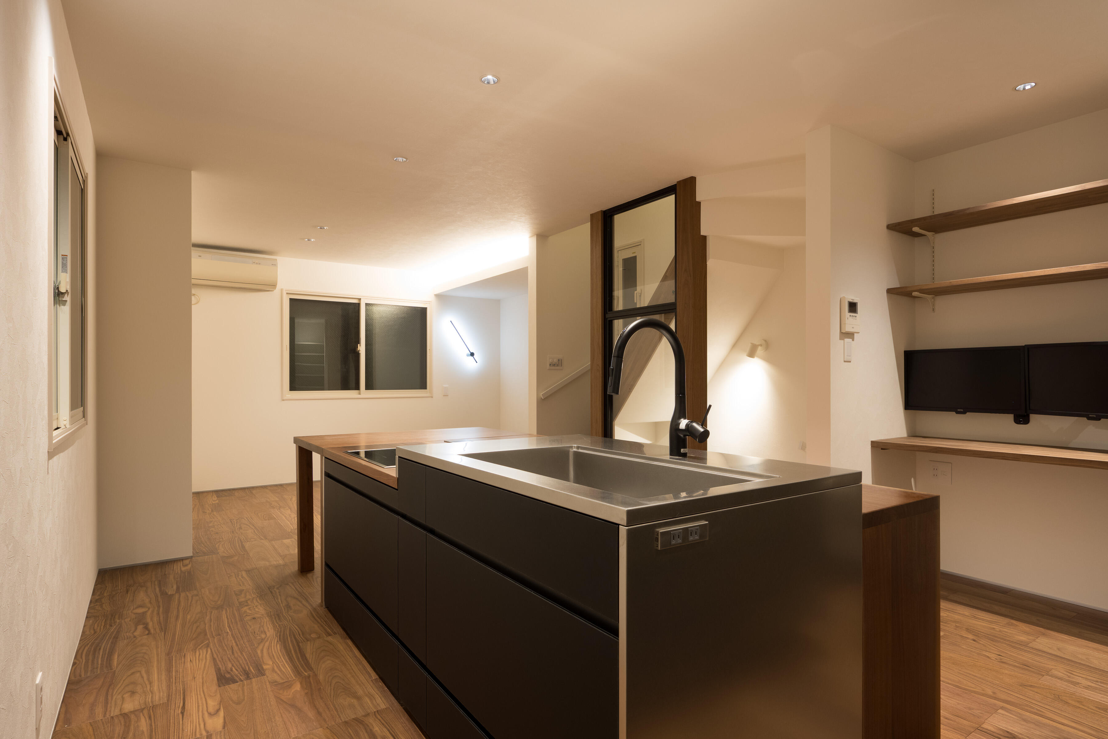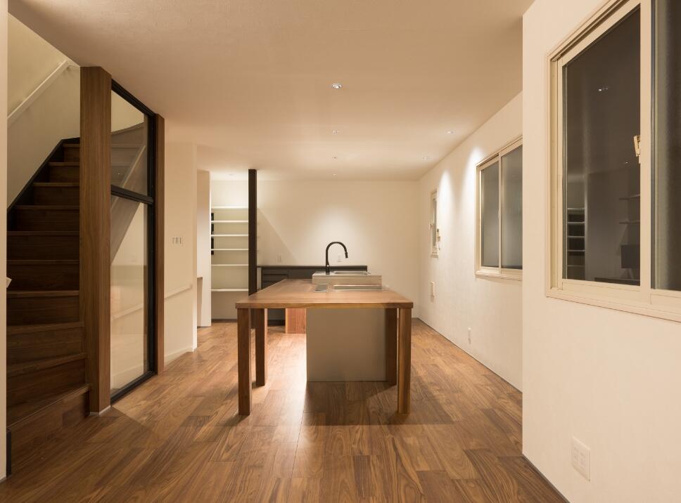 「狭小住宅だから」と可能性を狭めるのではなく、ガラス素材や丁寧な照明計画を取り入れることで、実際の面積以上の広がりを感じられる空間に仕上げました。2階の中心に据えたオーダーメイドキッチンは、一見すると圧迫感が出そうな大胆なプランですが、回遊できる動線を確保したことで、どこにいても家族の気配を感じられる、心地よい一体感が生まれています。 また、既存床の上から重ね張りを行うなど、コストバランスにも配慮しながら、お客様の理想を丁寧に形にすることができました。