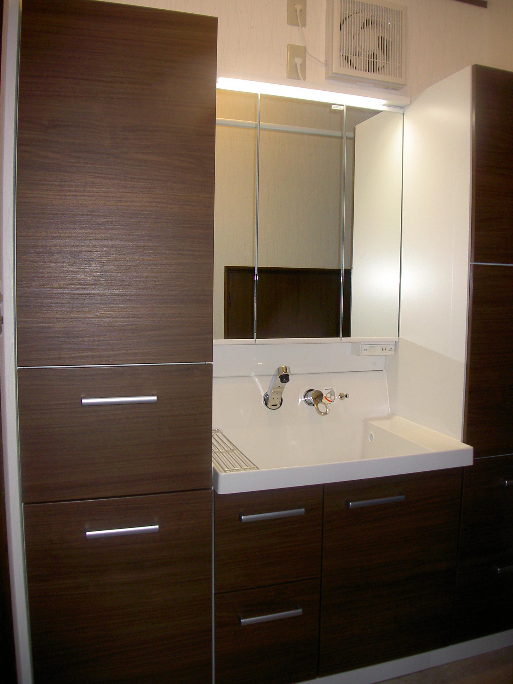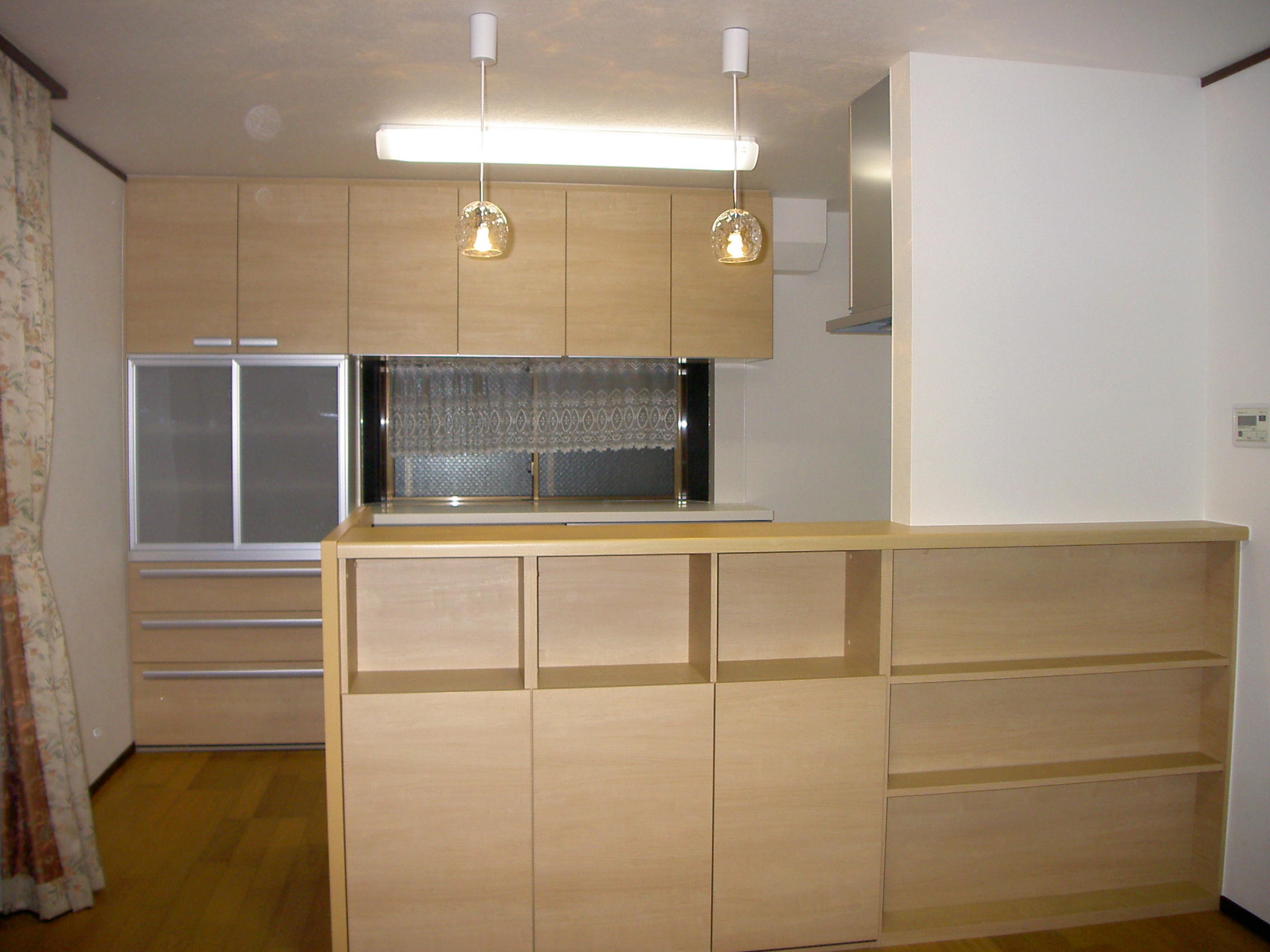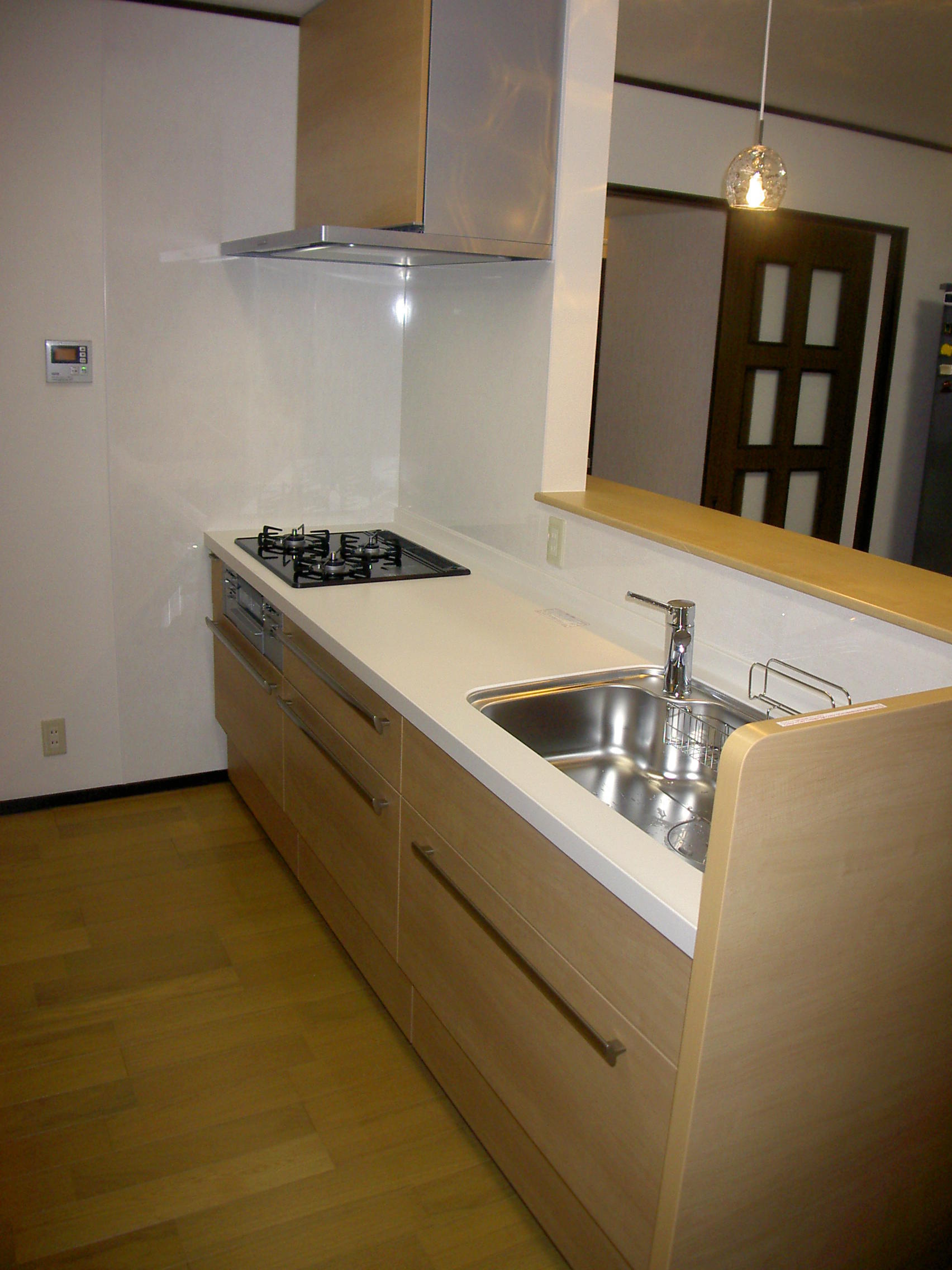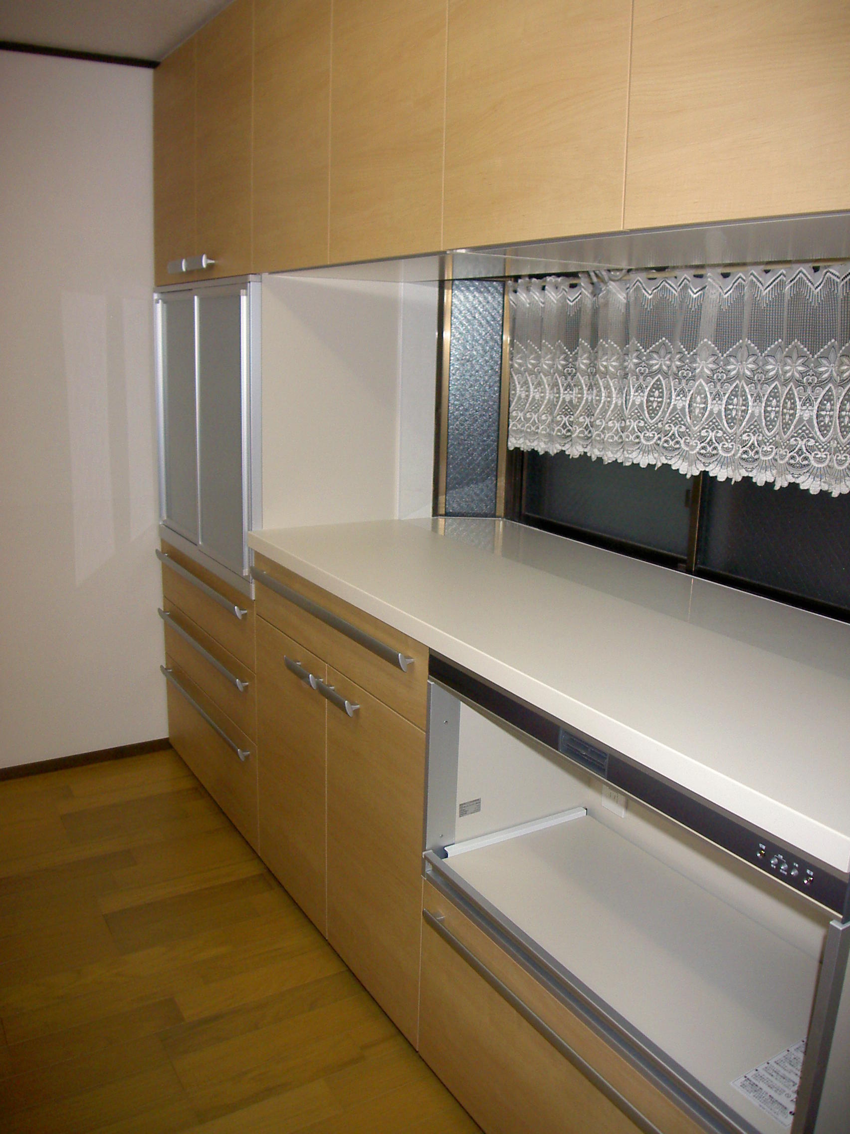 ご近所の方のご紹介でリフォームのご相談を頂いたS様。お嬢様ご家族が同居されるため、キッチン、洗面、トイレの水廻りをリフォームさせて頂きました。キッチンはお孫さんにも目が届くように対面式にして、リビングには床暖房を入れさせていただきました。キッチンの背面には、家電やごみ置き場を含めた収納を設置。壁にしっかり固定していますので地震対策にも。ご家族が増えても充分の収納力です!