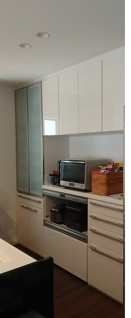 天井まで目いっぱいの収納で、たくさんの食器や食品、家電などを 収納できるようになりました。それでも余るくらいで文房具や小物も引出に収納することが出来ています。 収納は壁にしっかり取付をしてもらっているので、地震の時に倒れてくる心配もなく 子供たちも安心して使えるのが嬉しいです。 また、分別できるごみ箱も扉と同じ色なので見た目は分からず すっきりと納まっています。 遊びに来るお友達や両親にも大好評です。 長く大切に使いたいと思います。お願いして良かったです!
