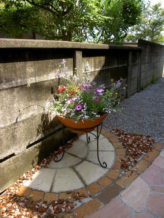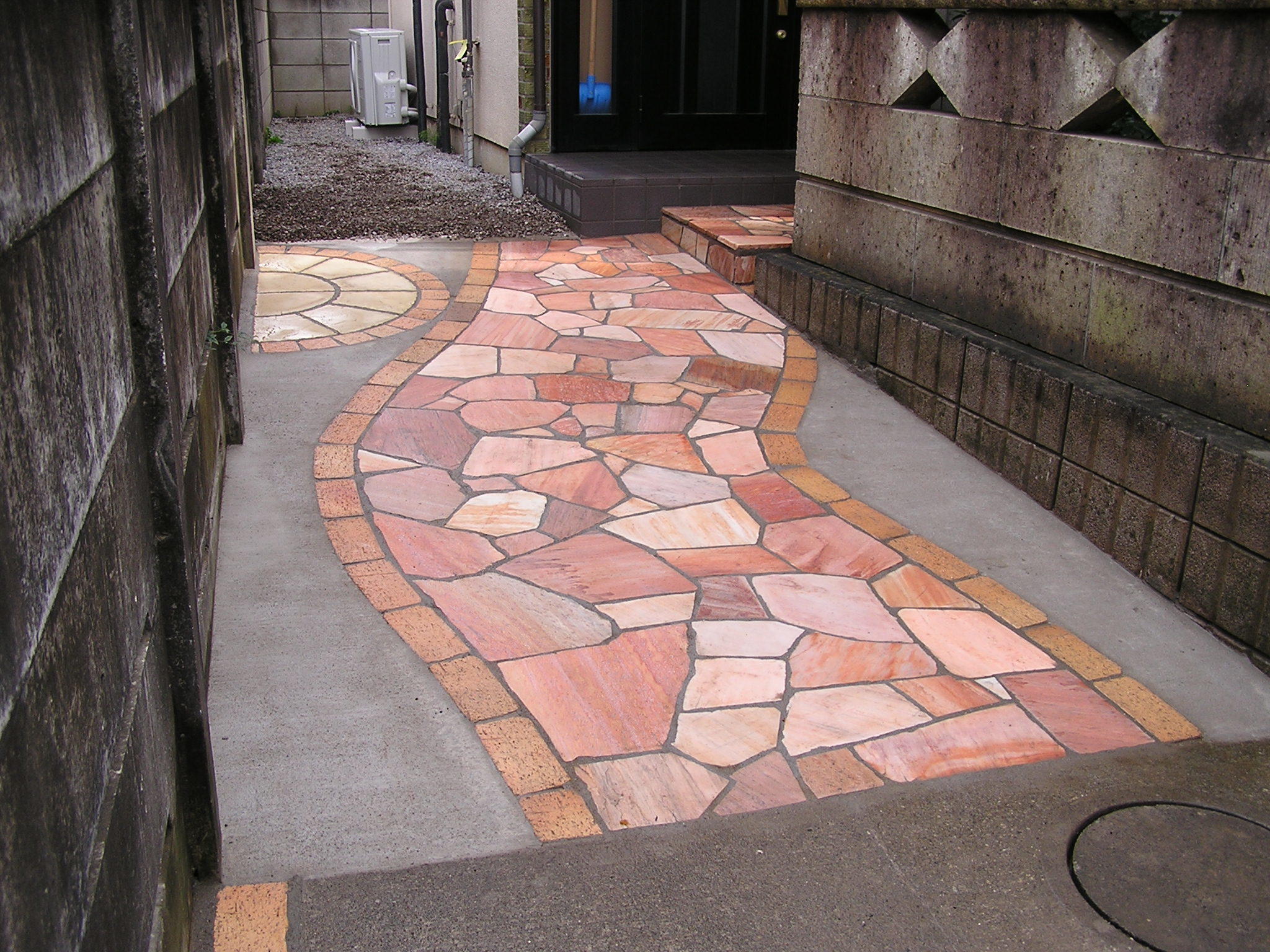 玄関までのアプローチにある飛び石の段差がお母様にとって 不安がある為、ご相談いただきました。 段差をなくしてバリアフリーにするのはもちろん、 明るい天然石の割り石で動きのあるアプローチにしました。