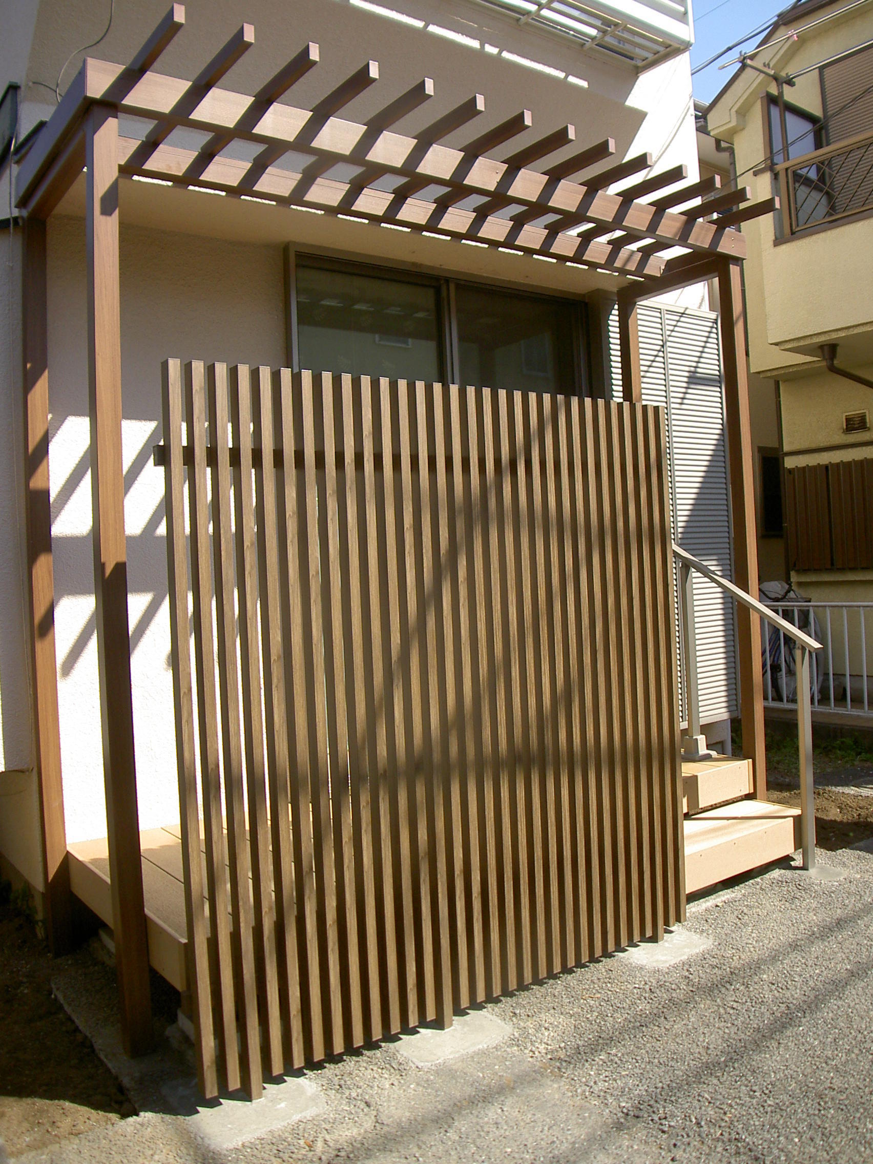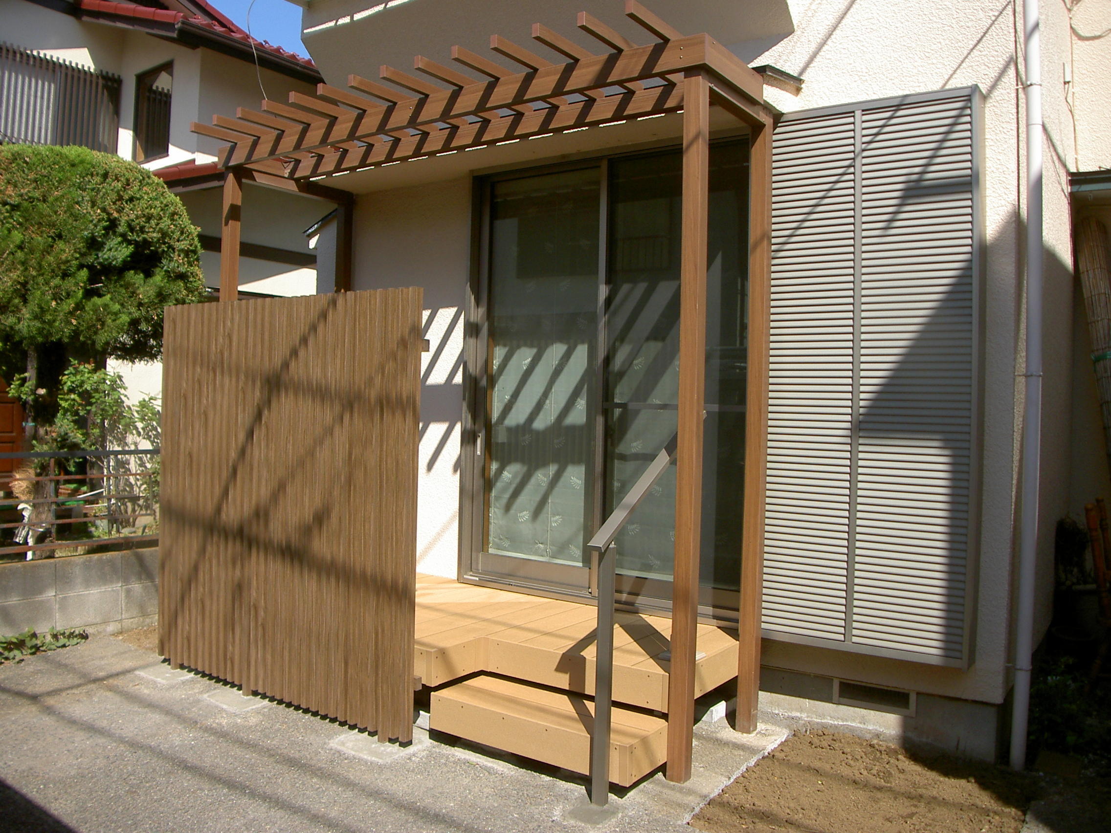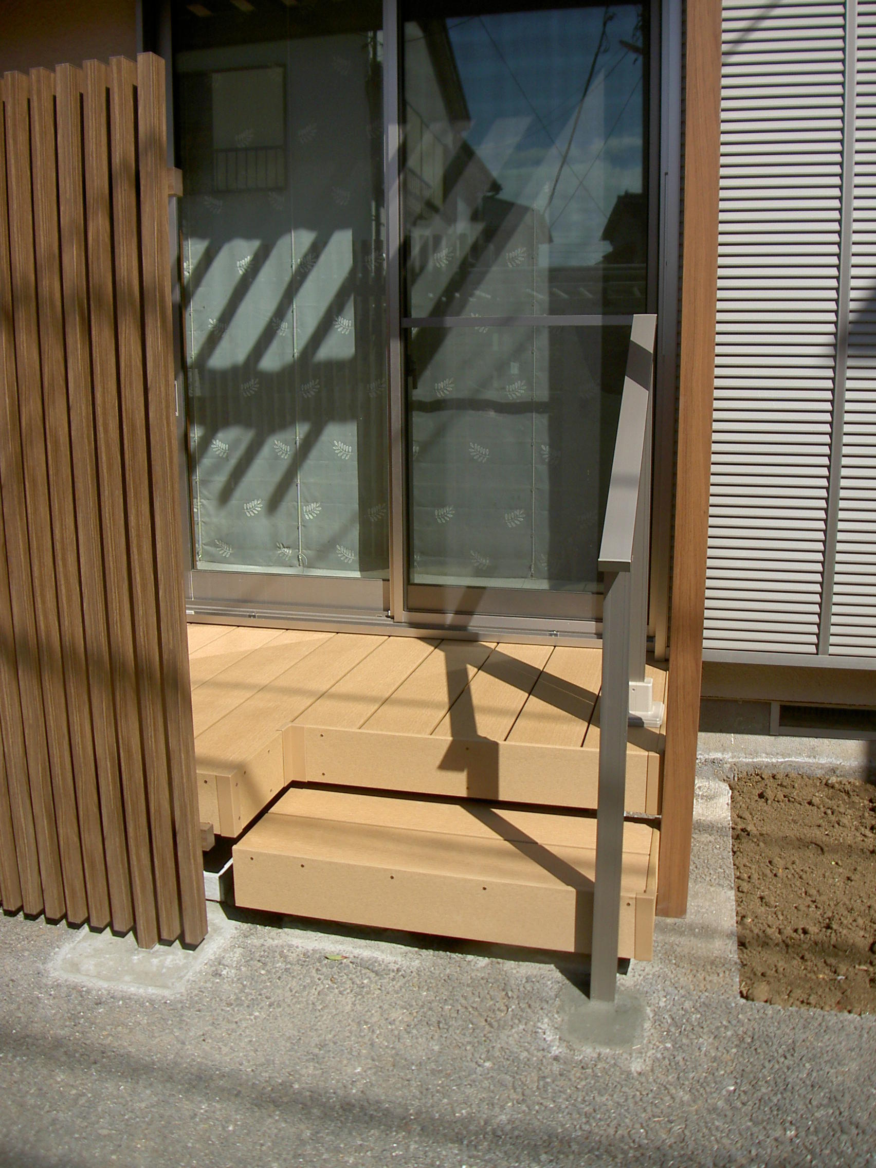 1F掃出し窓の外側にあった木製のぬれ縁を、駐車場側から出入り されるときには踏み台としてお使いでした。 しかし年数が経ってきたためぐらつきがあり、 また高さもあるために使い勝手にお悩みでした。 駐車場側から室内へ出入りがしやすいようなアプローチを兼ねて、 そして道路側からの視線を遮りながらリビングの解放感が 感じられるようにと、ご提案をさせていただきました。