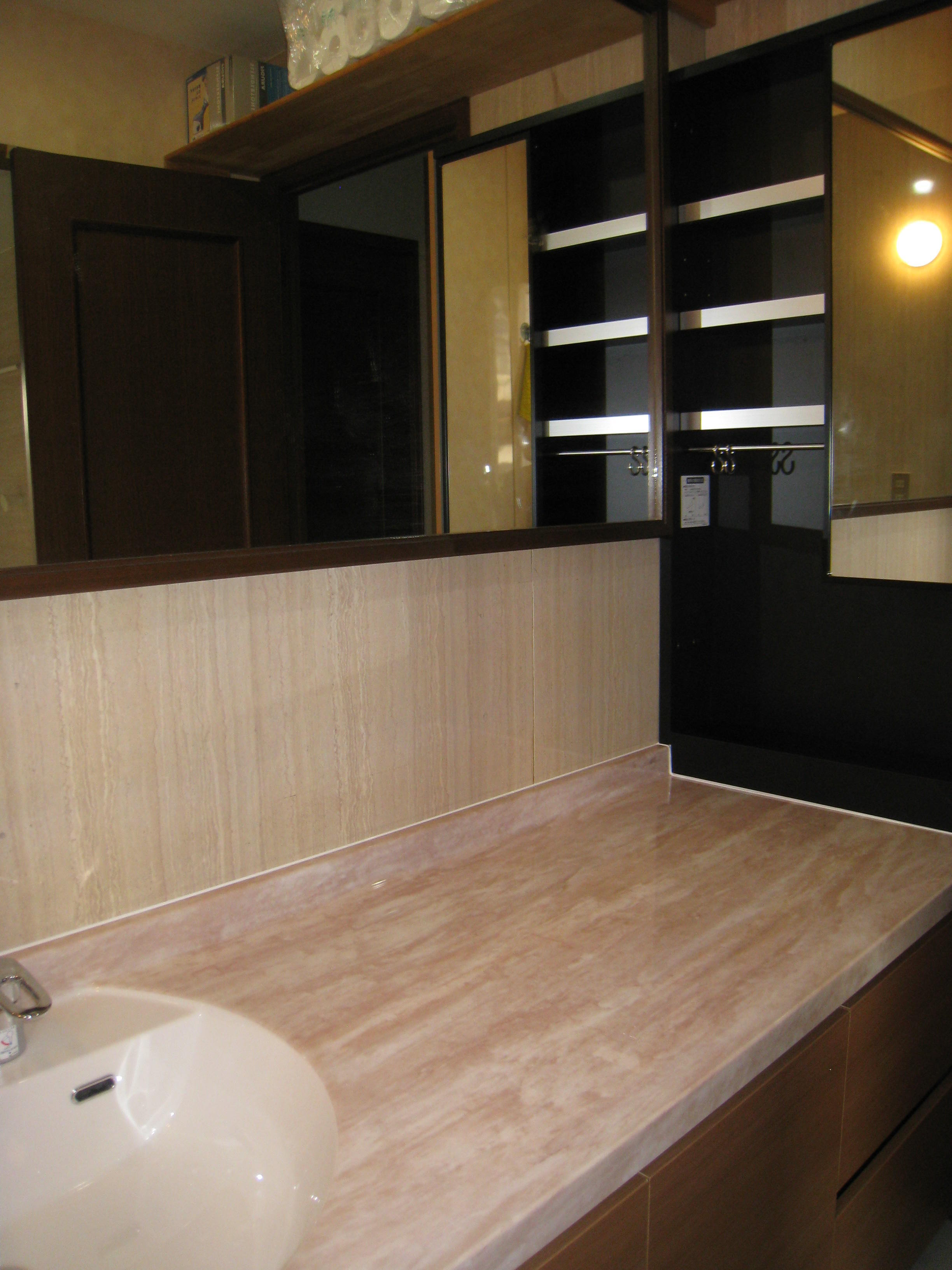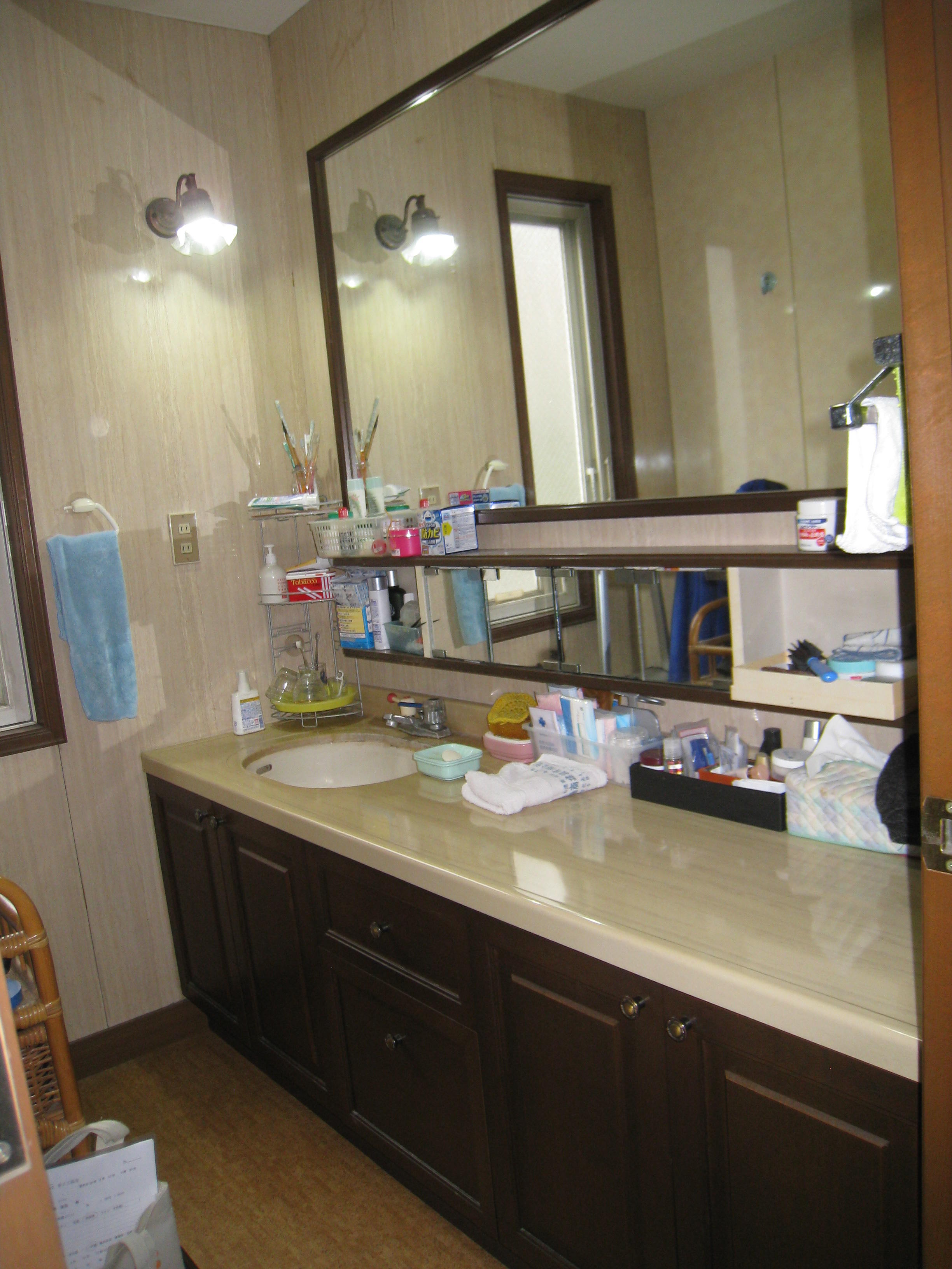 カウンターが少し傷んでいて気になっていました。カウンターの交換はできないということで既存の1面鏡はそのままに小物などは見えないように収納していただきました。照明もLEDに変えていただき明るくすっきりとした洗面室になりとても気に入っています。解体中に給水管の漏水が見つかり、良い時にリフォームできて良かったです。