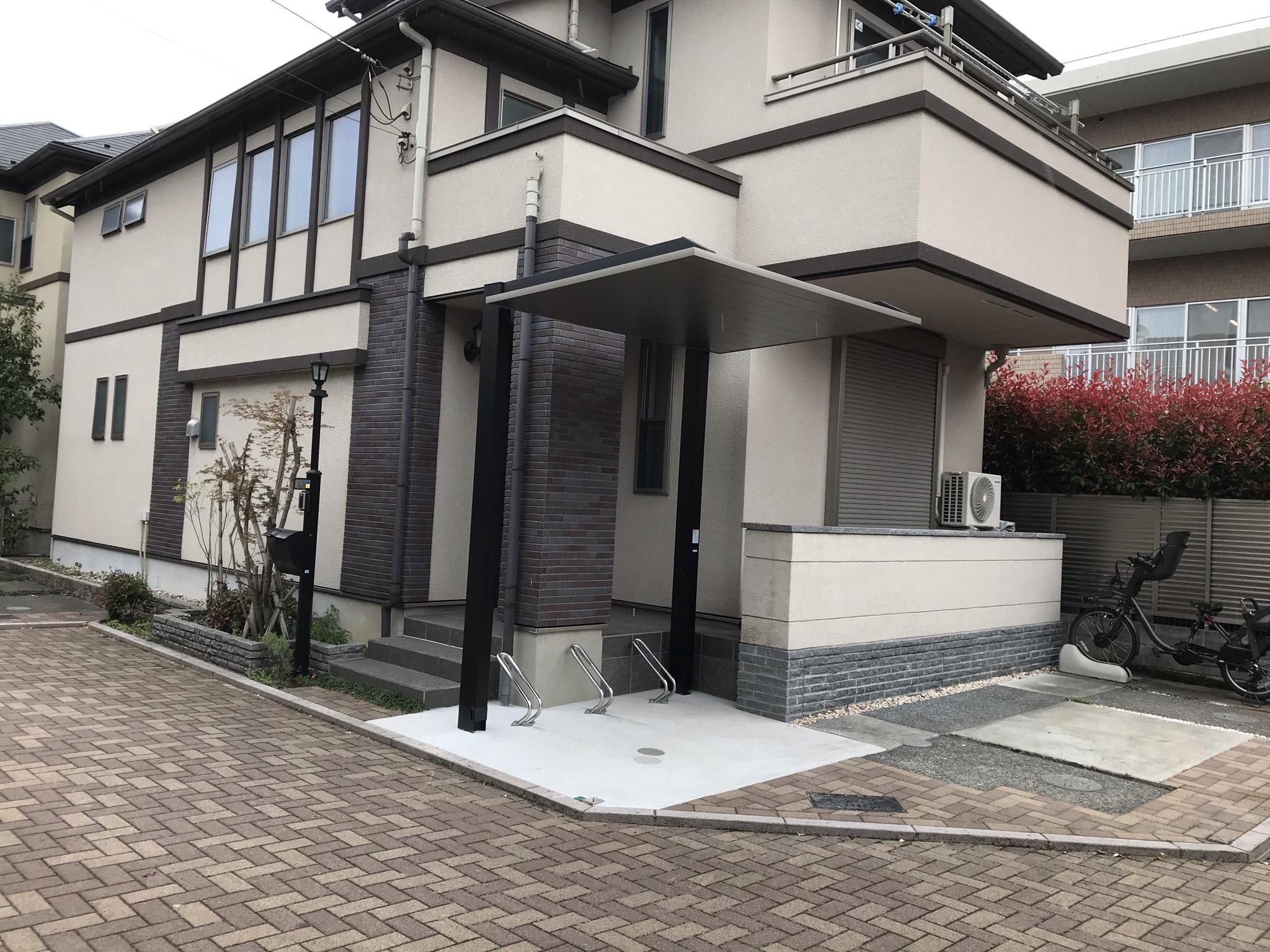 花壇を解体後のタイルと割石レンガを違和感なく仕上げることができました。ツートンカラーの落ち着いたカラーのサイクルポートは住宅外壁に美しく調和した素敵な外観となりました。