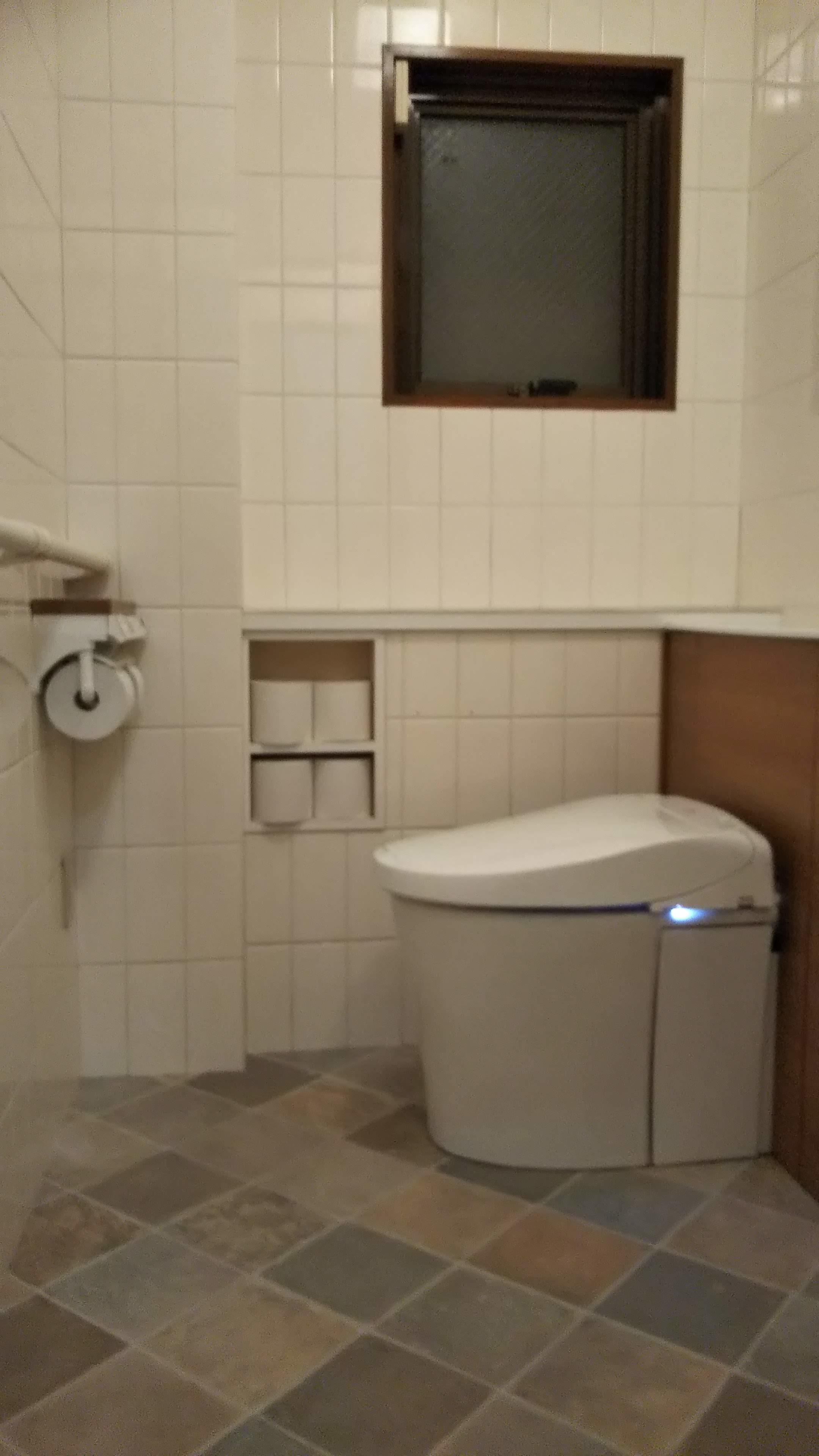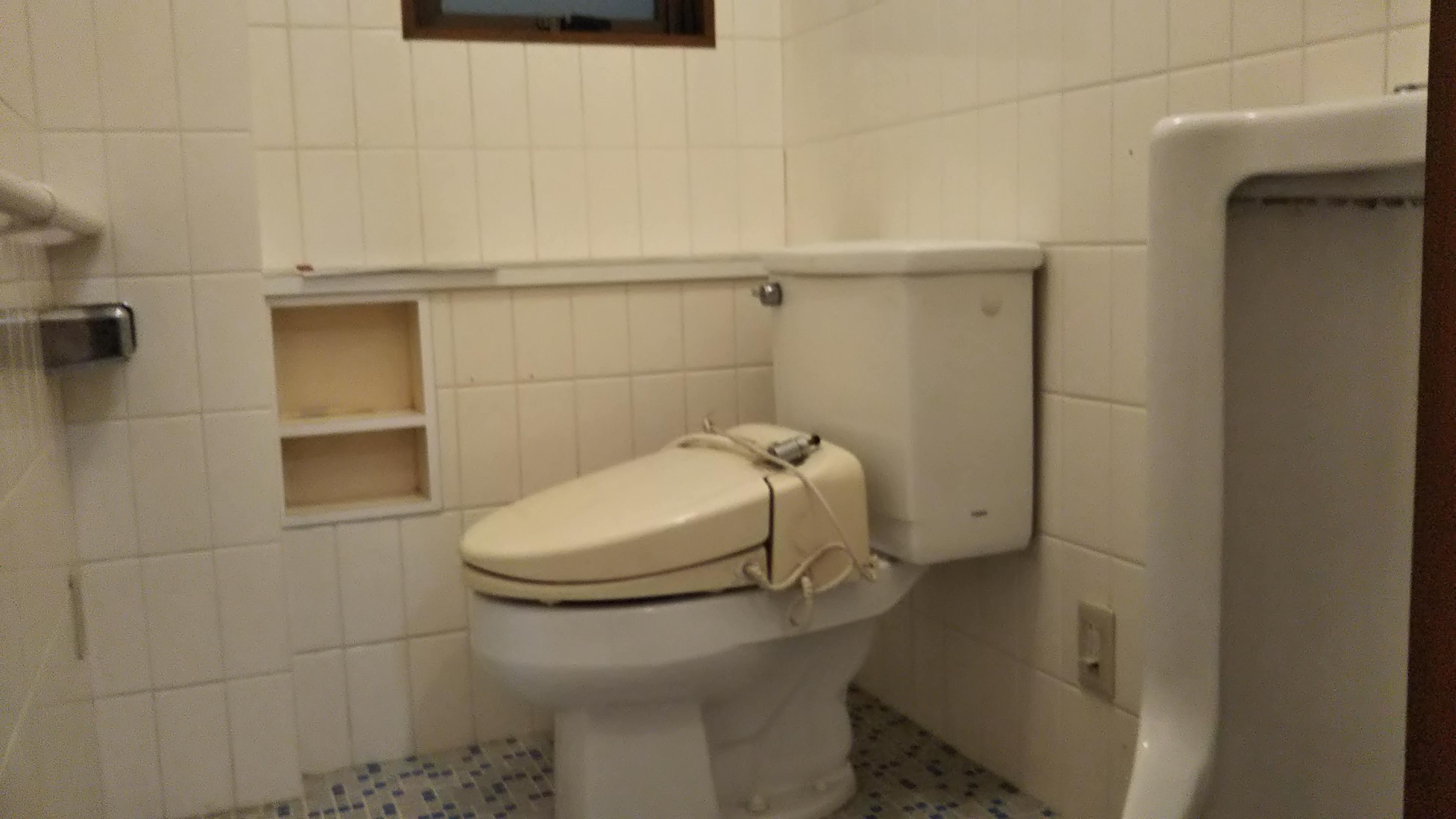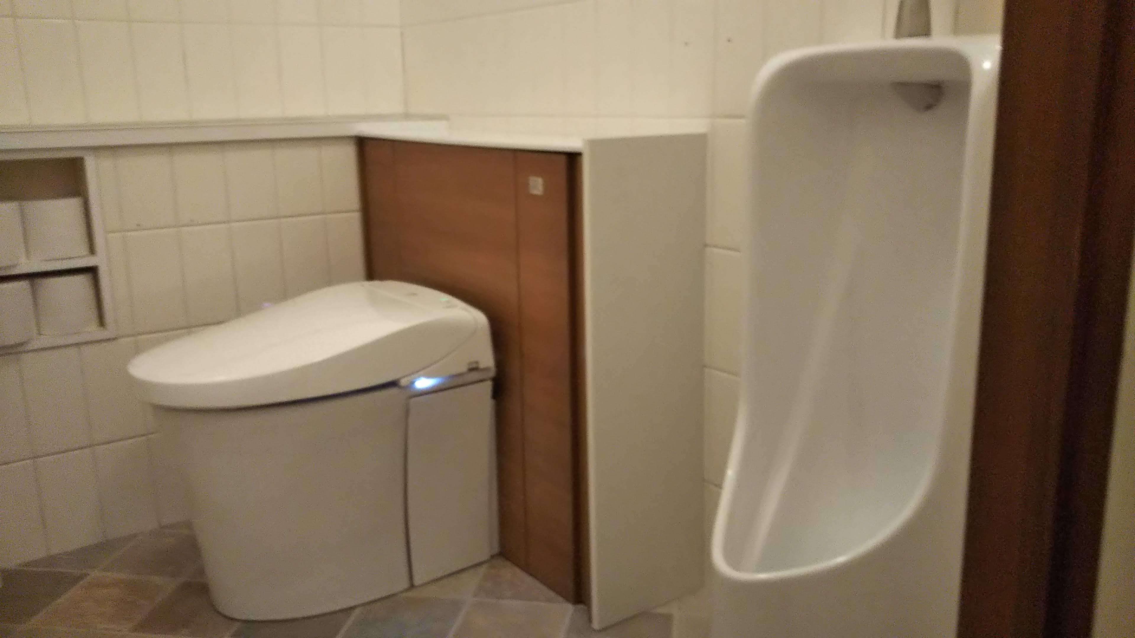 トイレ空間がすっきりするキャビネット付のトイレと自動洗浄付の小便器にリフォームしました。既存のタイル壁はそのままに床は長尺シートを貼りました。キャビネットと調和がとれた素敵なトイレになりました。