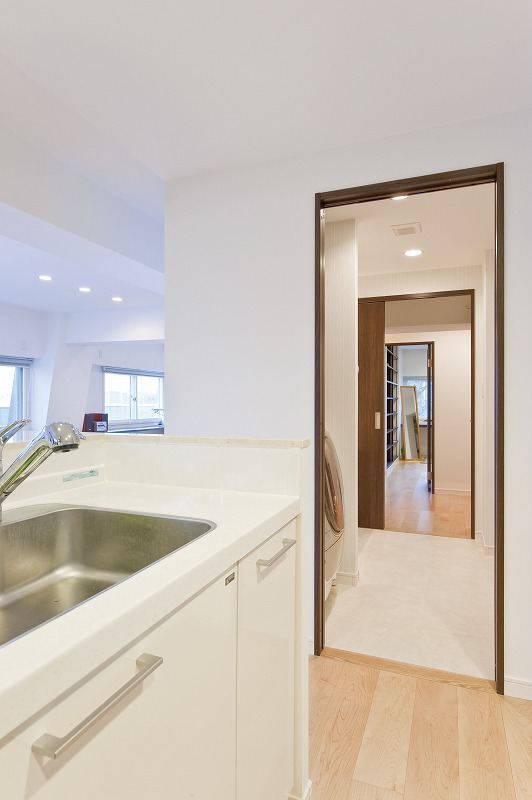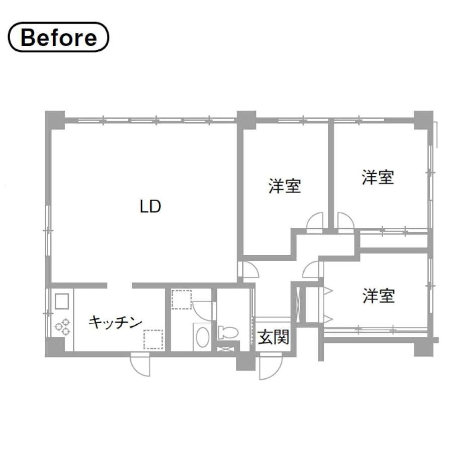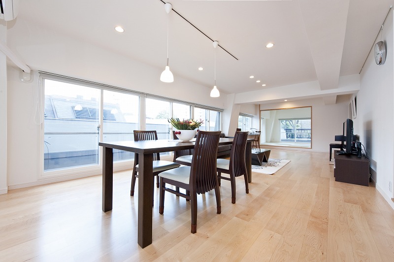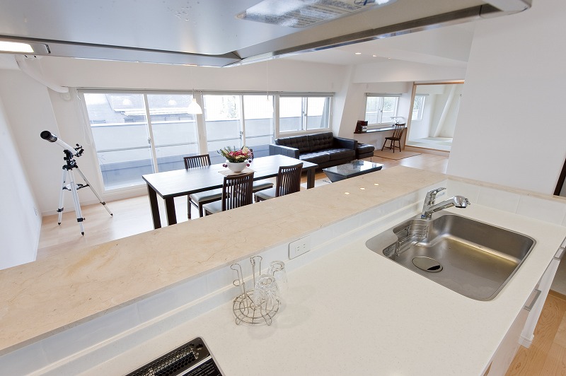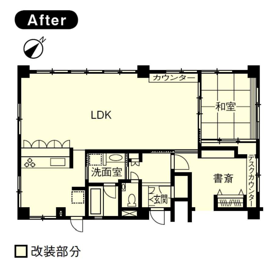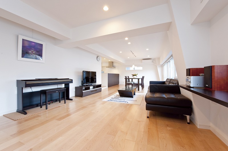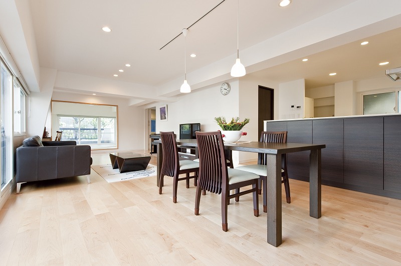 築43年になるご自宅マンションを手狭に感じていたという子育て中のHさん。 偶然、空室となった隣家を大規模リフォーム前提で購入しました。 雑誌で見た同社の北欧デザインに魅力を感じてさっそくショールームを見学。 「無垢材の材質やデザインテイストが気に入りました」と依頼を決められたそう。 天井が低く、狭く感じられたリビングは北欧の無垢フローリングを配した25帖超の開放空間に。 目の届く所で子どもが勉強できるようデスクカウンターも設置。 和室も開け放てばリビングと一体になるよう配慮し、家中をぐるりと回れる便利な動線も実現しました。