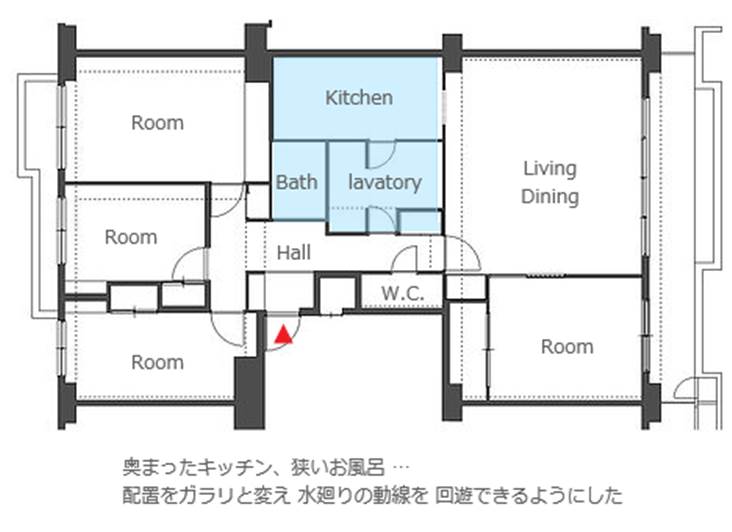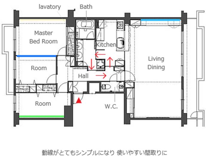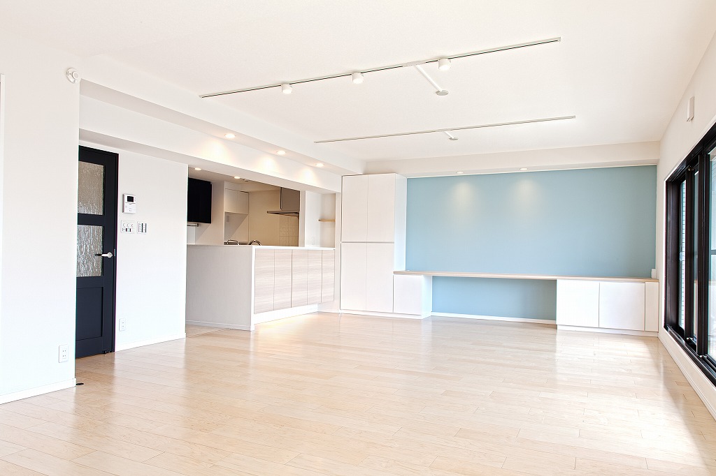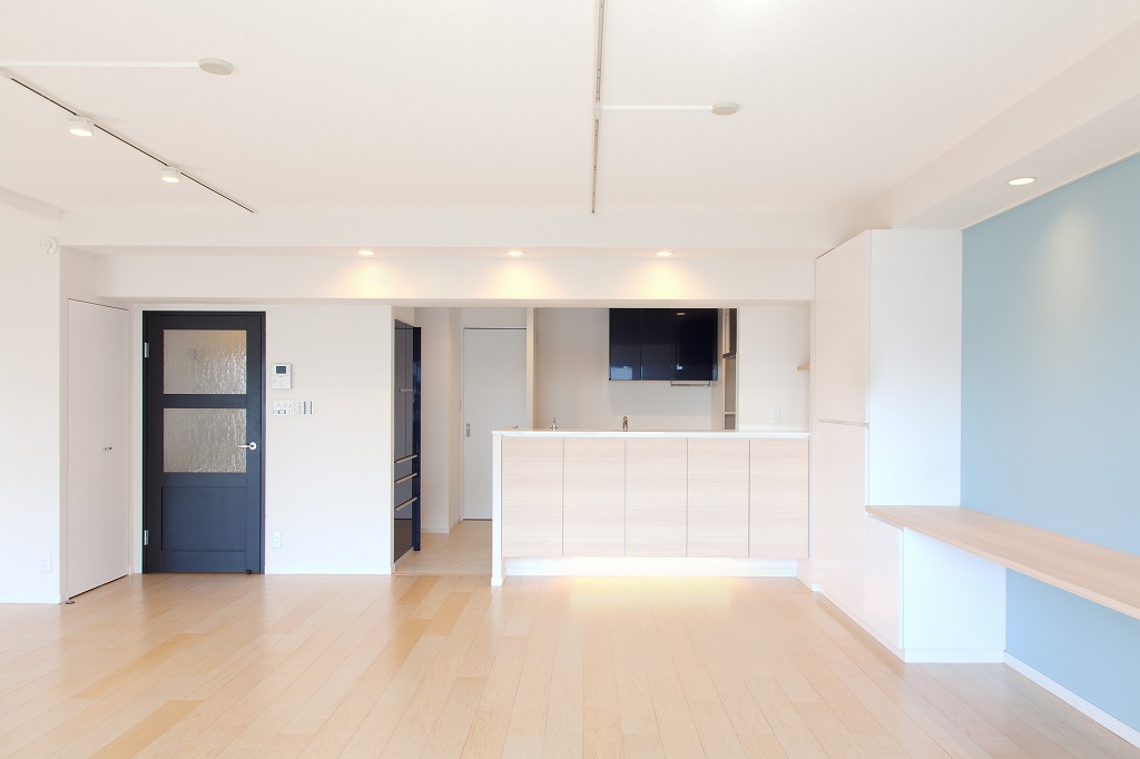 中古マンションを購入し、ここから一緒に住み始めるお若いSさんご夫婦。 アクセントウォールが、各お部屋の特徴をつくっていて とても良い雰囲気。 プライベートルームでは、お2人の思い描くイメージを色で表現しました。 全体的にスッキリとしていて 爽やかな空間の印象は ここから新たな生活をスタートさせる お2人にぴったり。 リフォームの要となった水廻りの動線とキッチン。 2人でも立てる広さと使いやすさはもちろんのこと、インテリア性も重視。 雑然としがちな手元は、表から見えないプランニングに。 お部屋の床はハードメープルを採用。 その色に合わせ、ダイネットカウンターや製作家具、棚もコーディネート。 玄関を入ってすぐのウォールや、洗面室、トイレ手洗器のタイルも軽やかです。 所々に配した間接照明は、夜になると昼とはまた違った表情で、 ご夫婦のくつろぎの時間を演出してくれます。