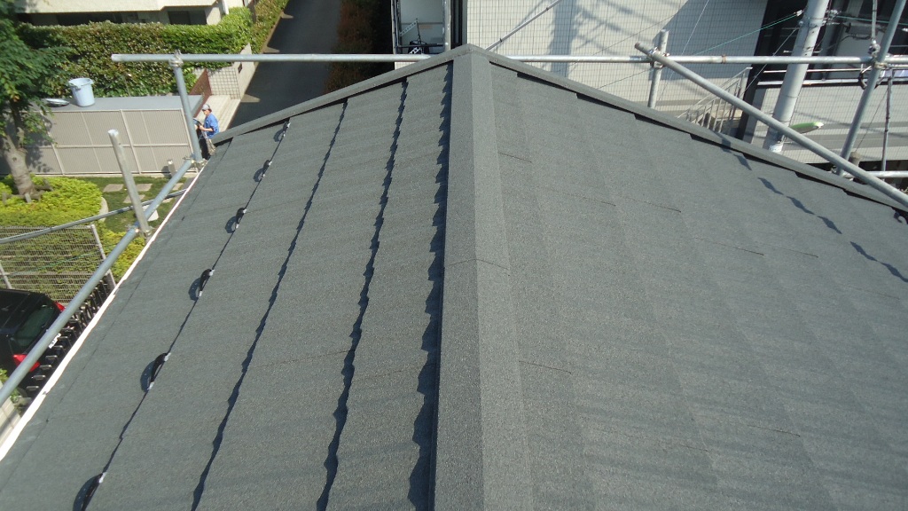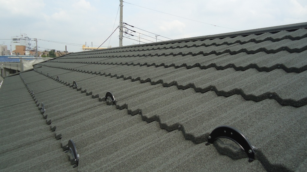 LIXILのTルーフを採用しました。 材料は、ガルバリウム鋼板に天然石をコーティングしたものです。 素材は軽く、手軽に美しい景観が演出でき、美観10年、基材30年が保障されています。