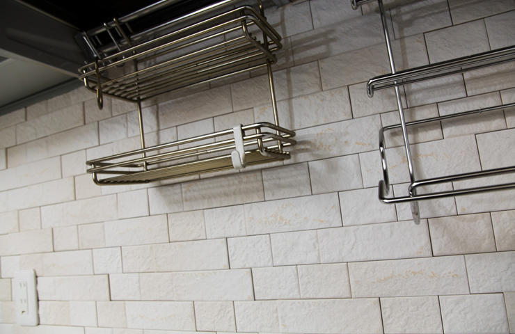 リビングの壁一面と、キッチンの正面にもエコカラットを貼りたいとご希望でした。 エコカラットはキッチンに不向きな内装タイルの為、他のタイルも提案させて頂きましたが、リビングに貼るエコカラットと似たような物が無かった為、エコカラットをキッチンに貼った場合の注意点を説明し、キッチンにもエコカラットを貼らせて頂きました。 壁一面がエコカラットになると壁にフックなど付けられなくなってしまうので、ピクチャーレールも付けさせて頂きました。