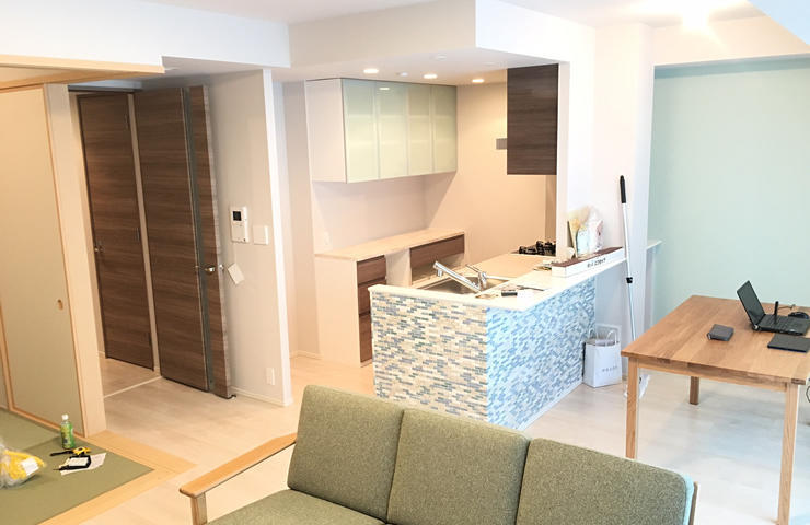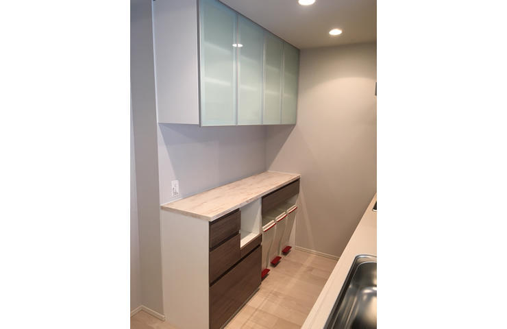 キッチン収納はオーダーとし、ごみ箱スペースなど、どんなサイズものをどこにしまうかをすべて仕様に落とし込みました。 キッチン背面のタイルには、テーマカラーを含んだタイルを貼りました。