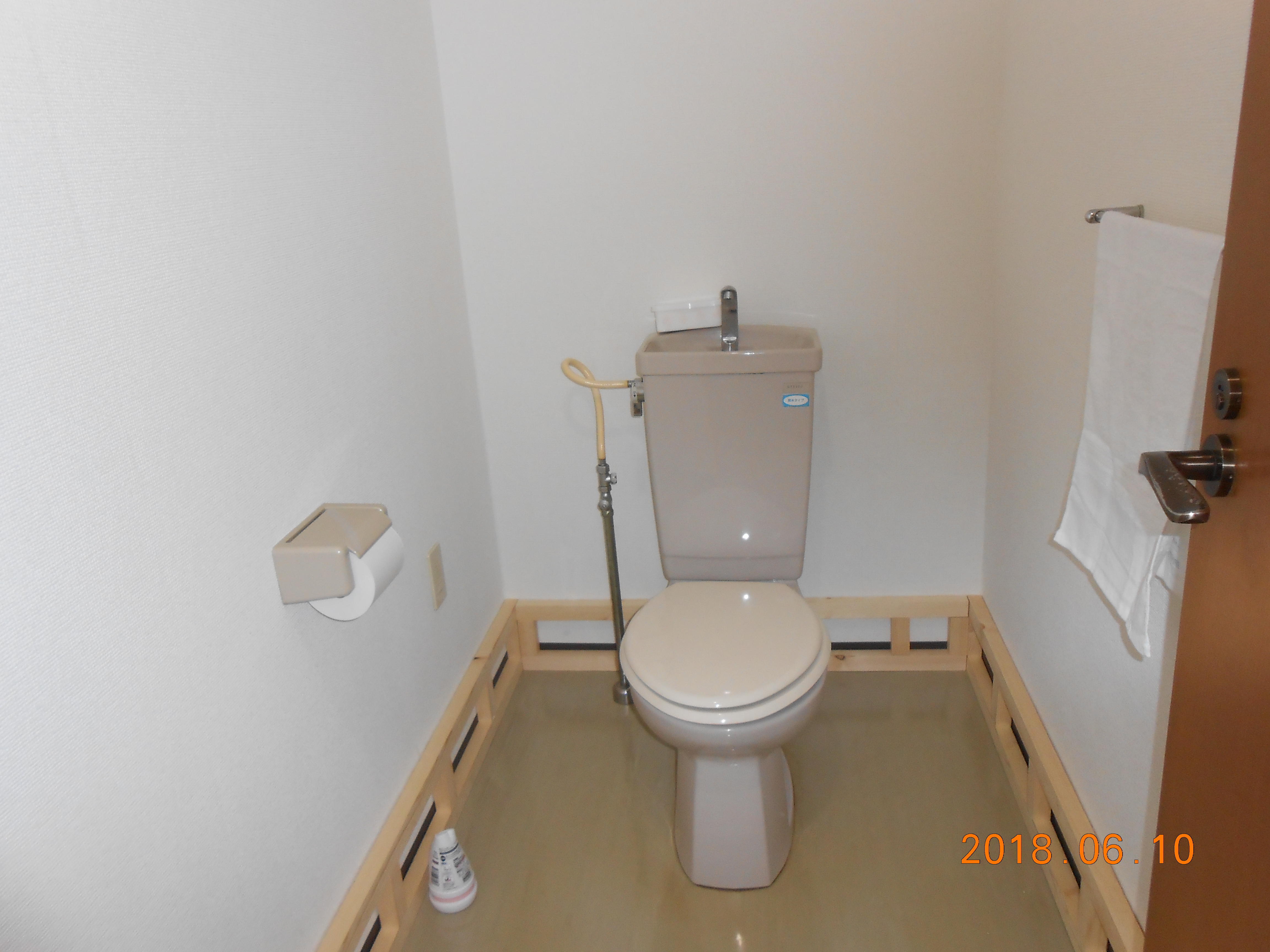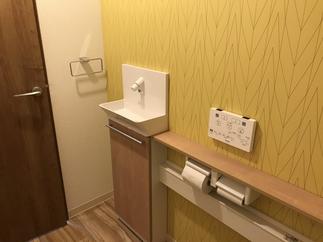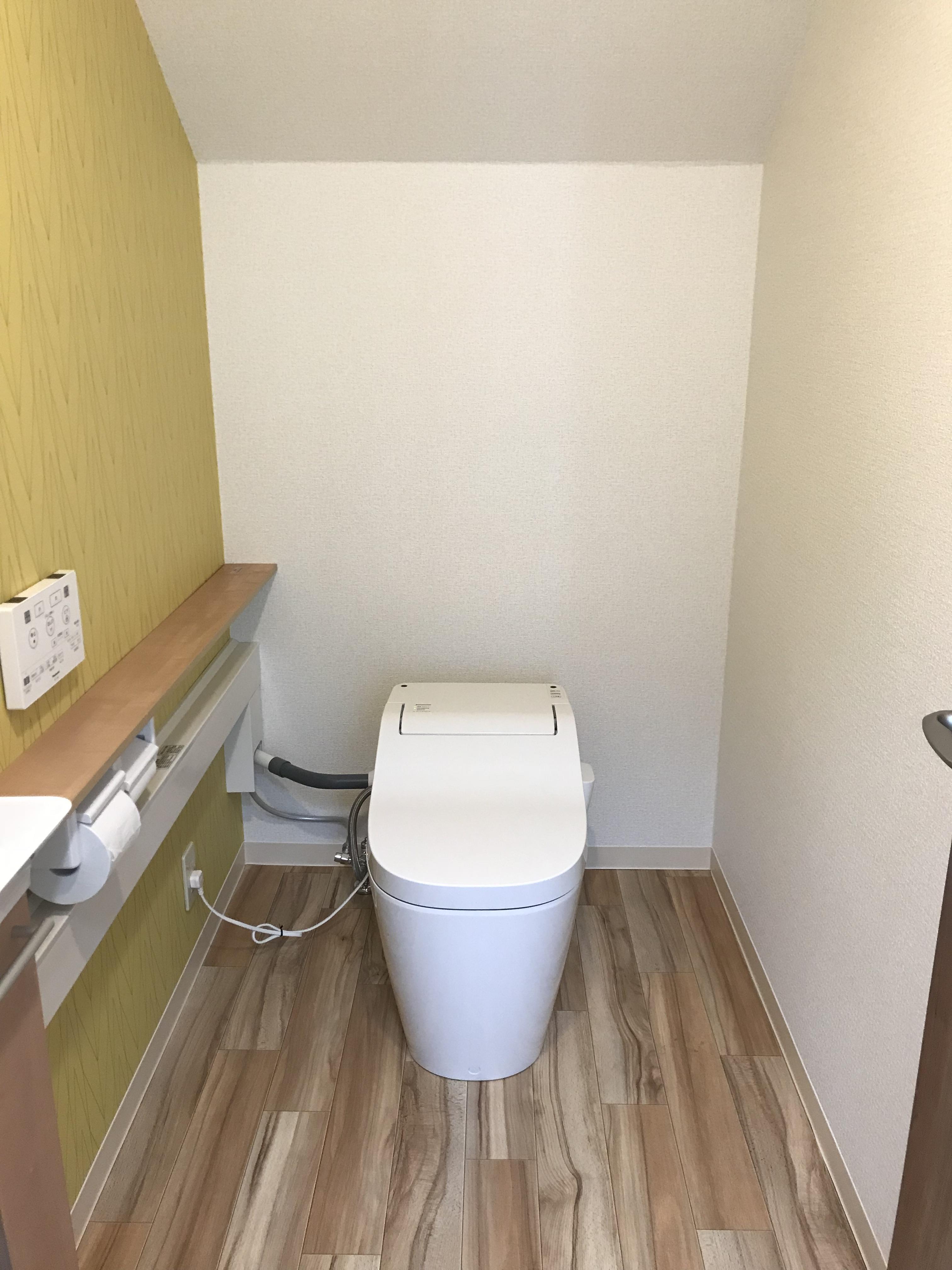 某事務所のトイレを一般的なタンク付タイプのトイレから、タンクレストイレにリフォーム。内装もこだわり、CFは木目調に、壁は一面にアクセントクロスを取り入れ、明るい雰囲気に。今回はお客様のご指定によりPanasonicのアラウーノSⅡにリフォームしました。アラウーノSⅡは「スゴピカ素材(有機ガラス系新素材)」で出来ているので陶器より軽く、汚れの原因「水アカ」が固着しにくく、お手入れがとても簡単です。