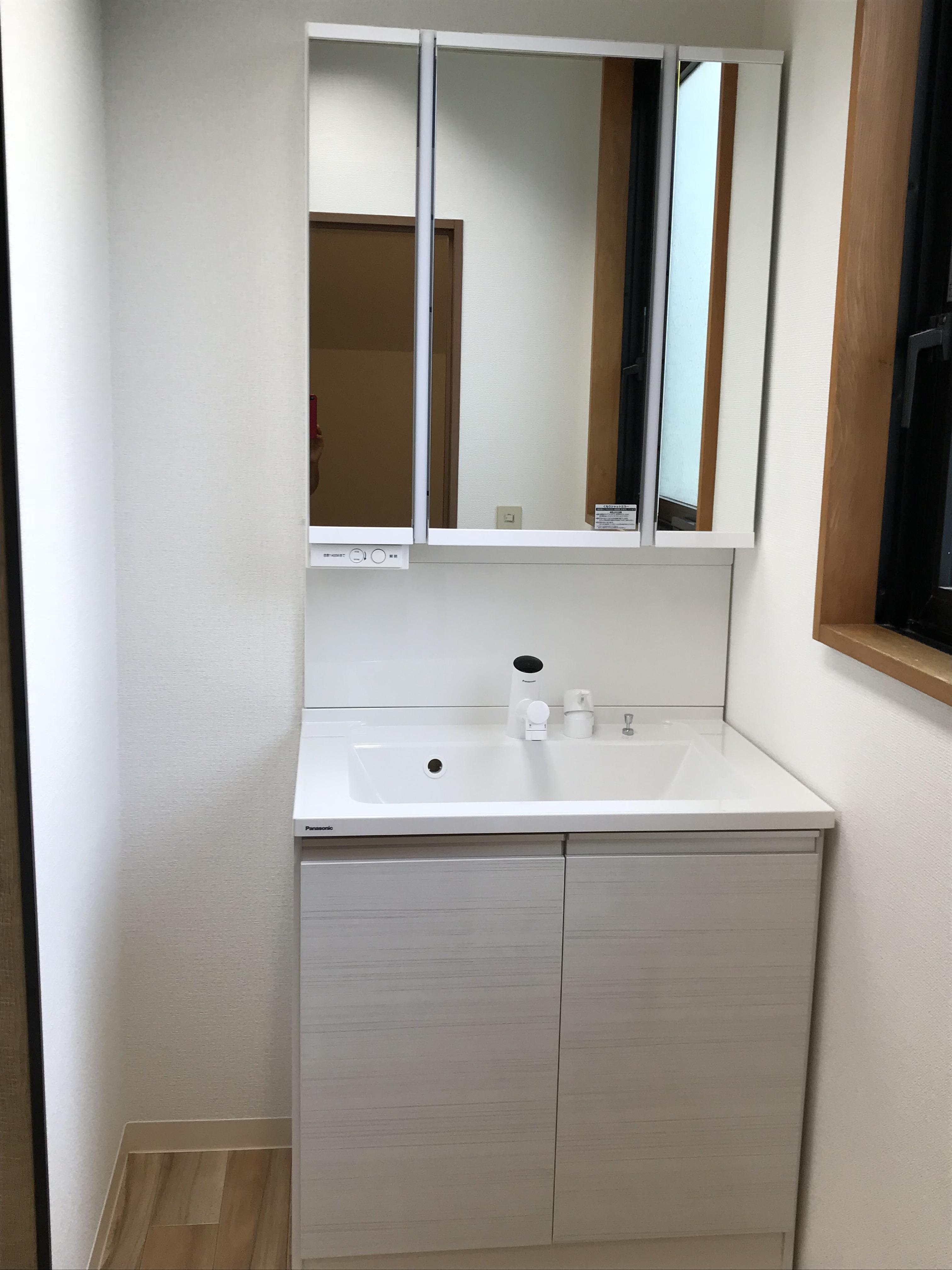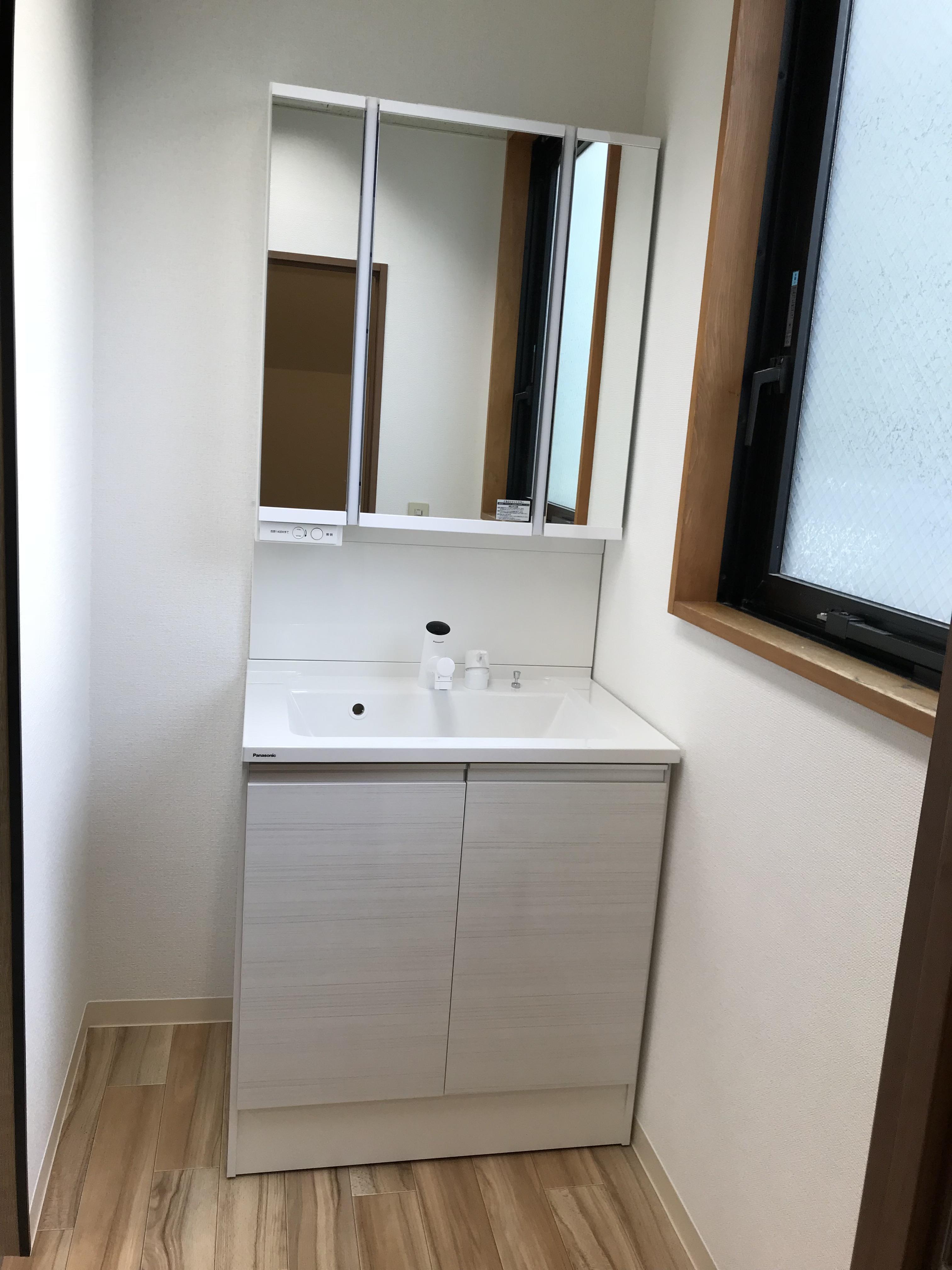 1.5㎡ほどのちょっとしたスペースを利用して、新しく洗面化粧台を設置。給排水工事・床の張替もあり工事には約2日ほどかかりました。電気温水器を利用して、給湯が無いところでもお湯が使えるように。タッチレス水栓なので手をかざすだけ。