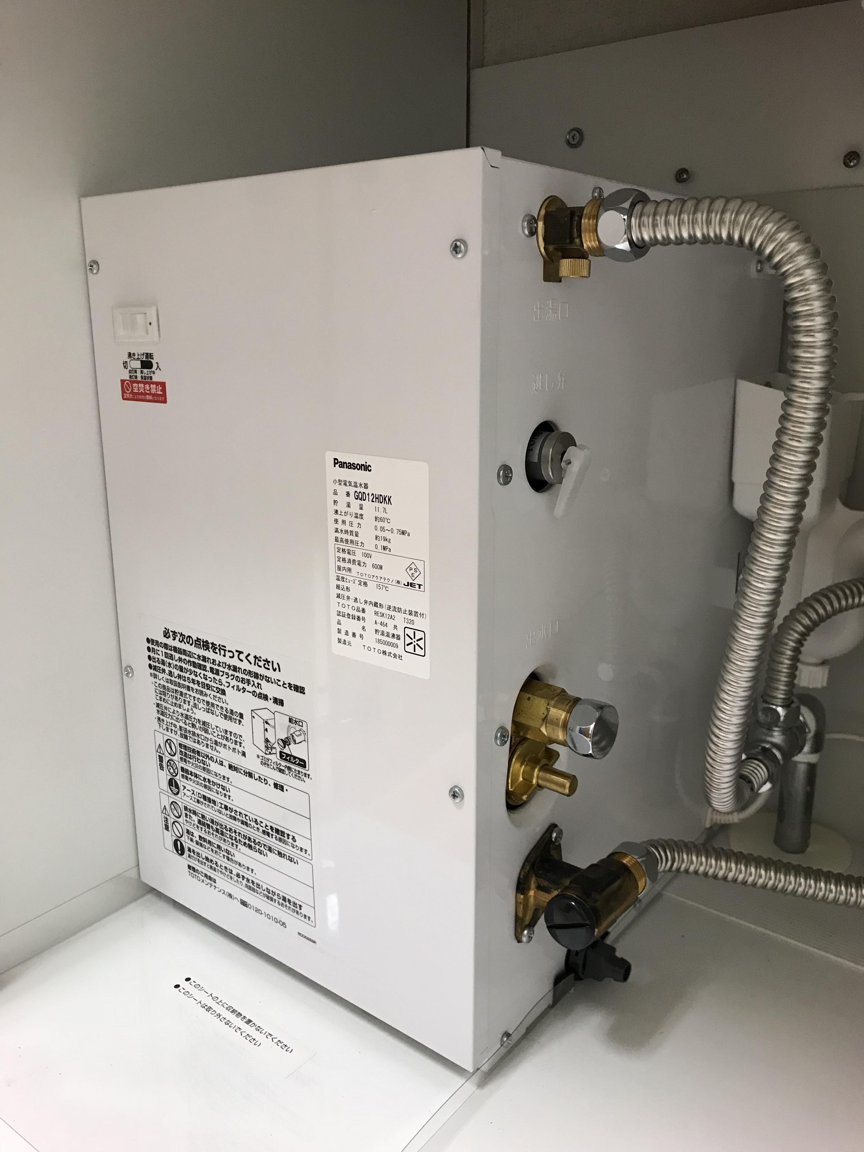 洗面台の下の開きの中に置いてある、こちらが電気温水器です。給湯が無くてお湯が使えない…と諦めなくても大丈夫なのです。水の配管と電気があれば、お湯を使うことが出来るのでとても便利なのです。