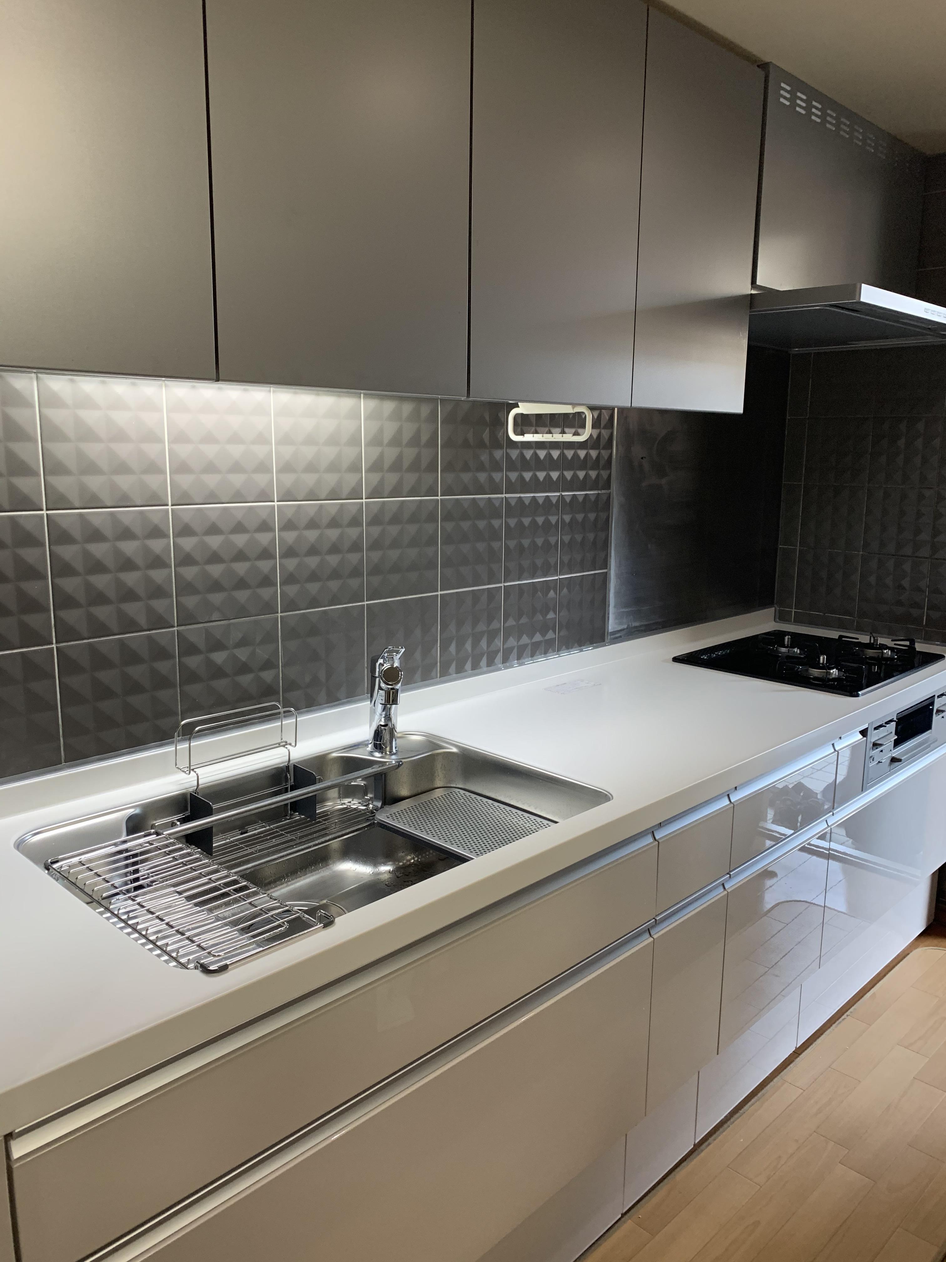 漏水によりキャビネットがぬれてしまい、取替をする事になったお客様でした。吊戸棚に近い色か、ガラッと色を変えるかで悩まれて、明るい色に決定されました。ツートンカラーでおしゃれなキッチンになりました。 ちなみに新しい下の色は鏡面のミストベージュです。お掃除もラクラク・Wサポートシンクで作業効率があがると嬉しいです。