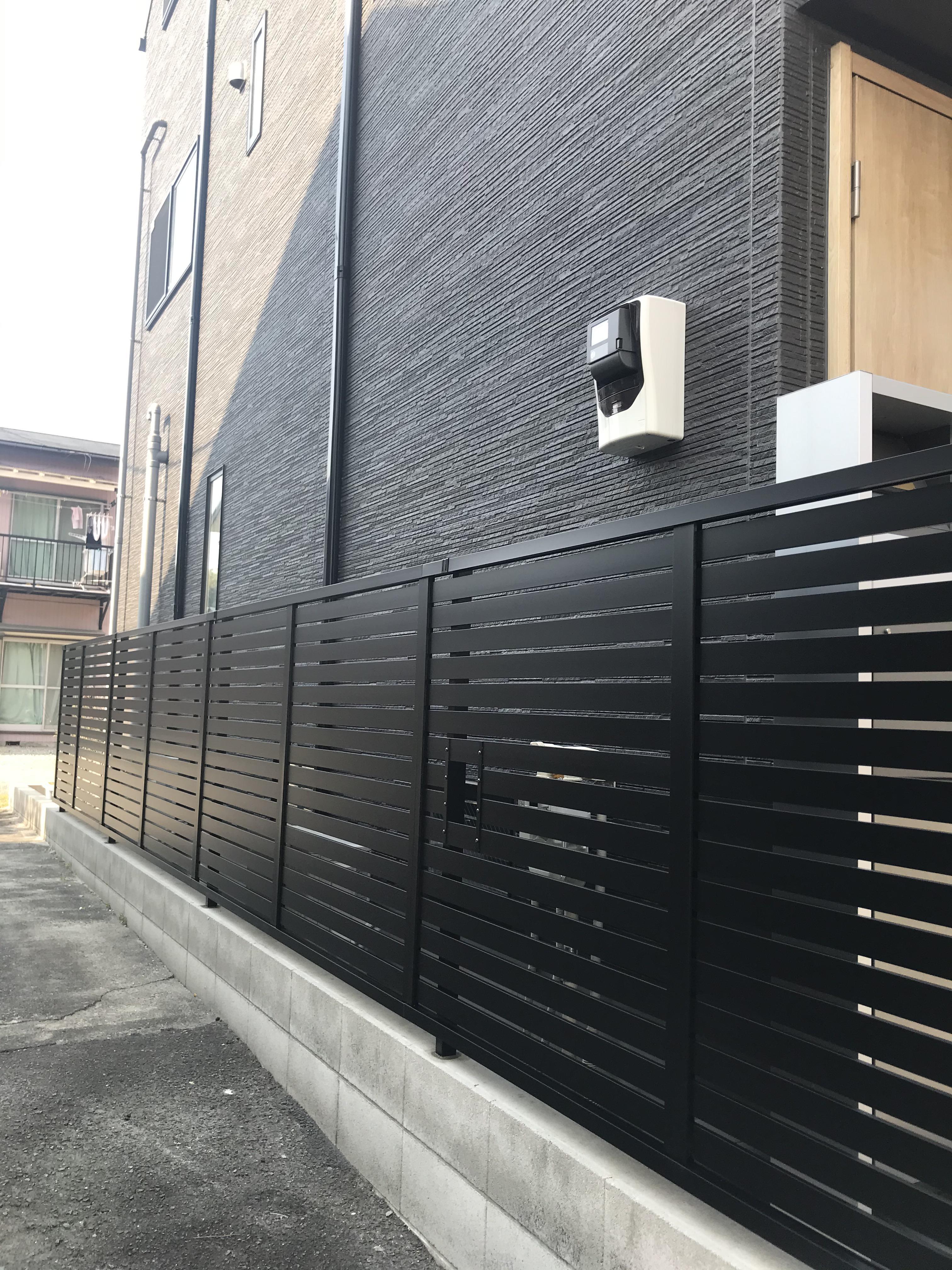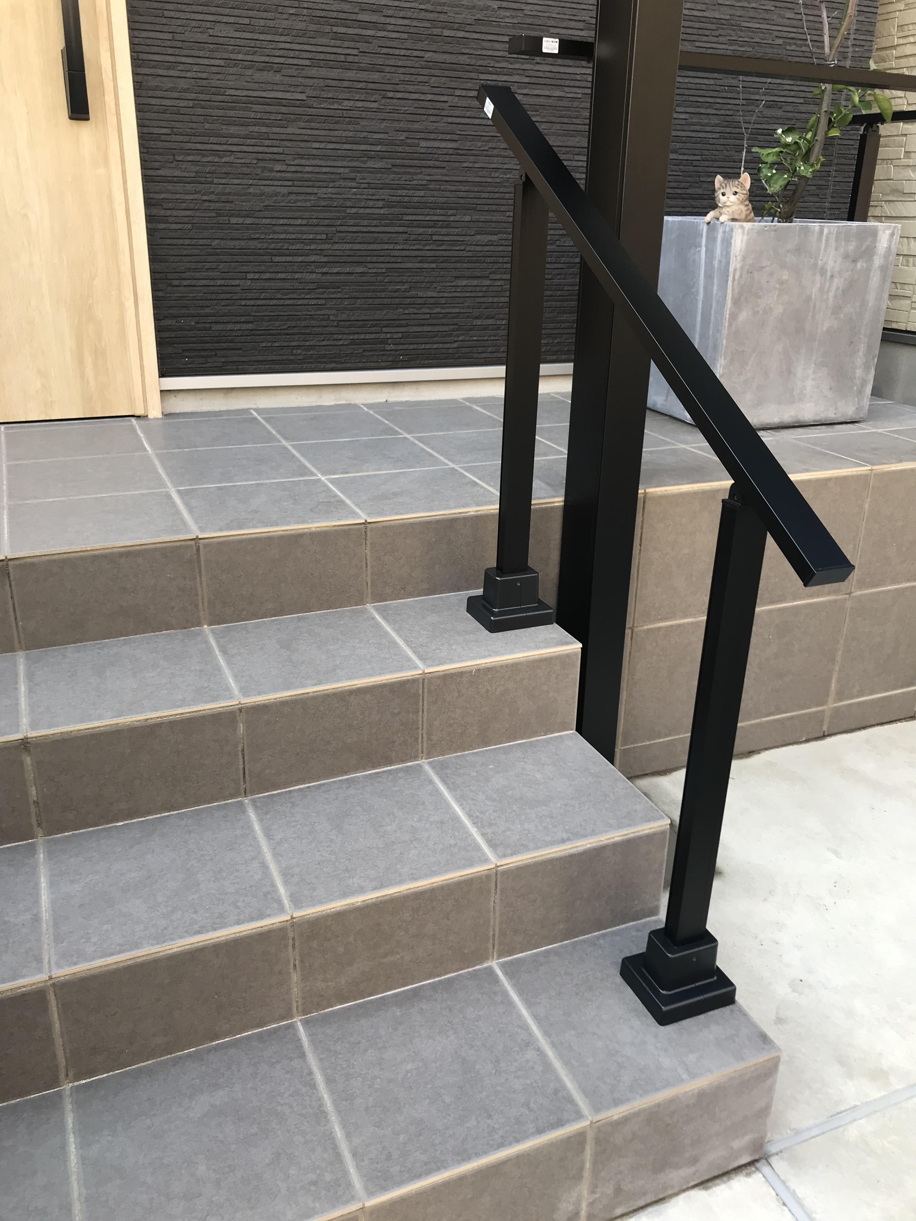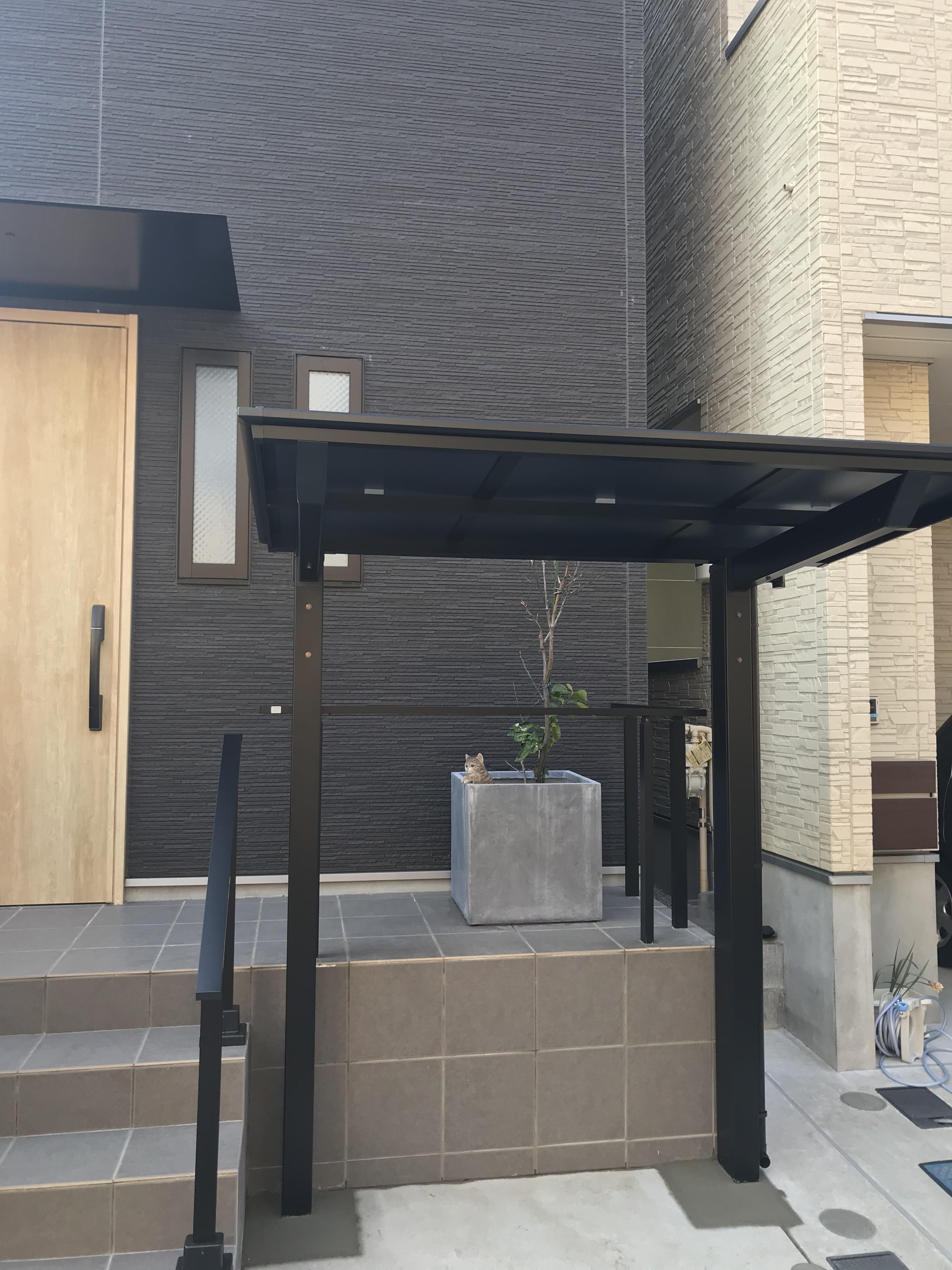 ダークグレーの外壁にクロのフェンスと手摺とサイクルポートがとても合っています。 シックでおしゃれなお住まいが更にグレードUPしました。
