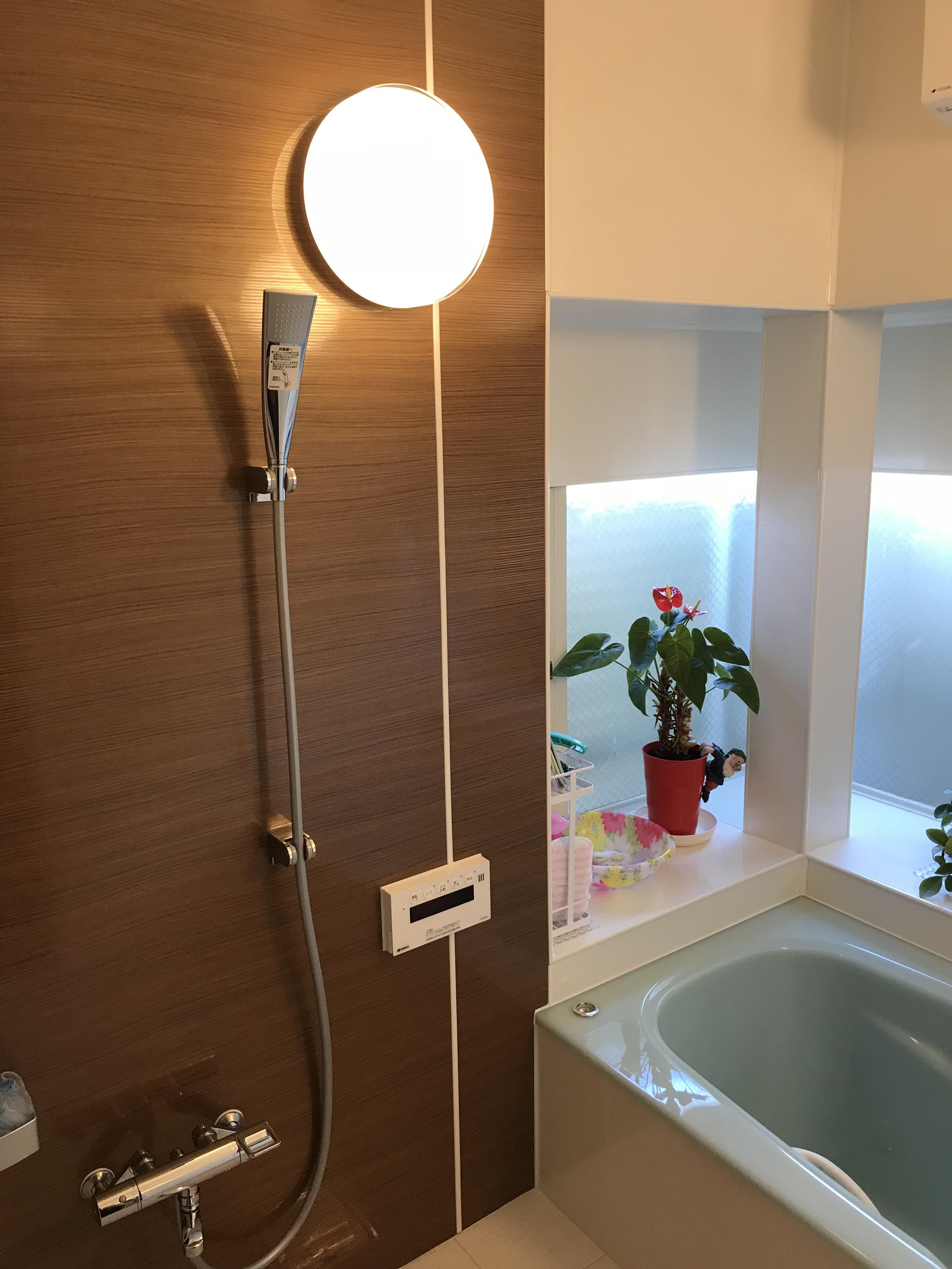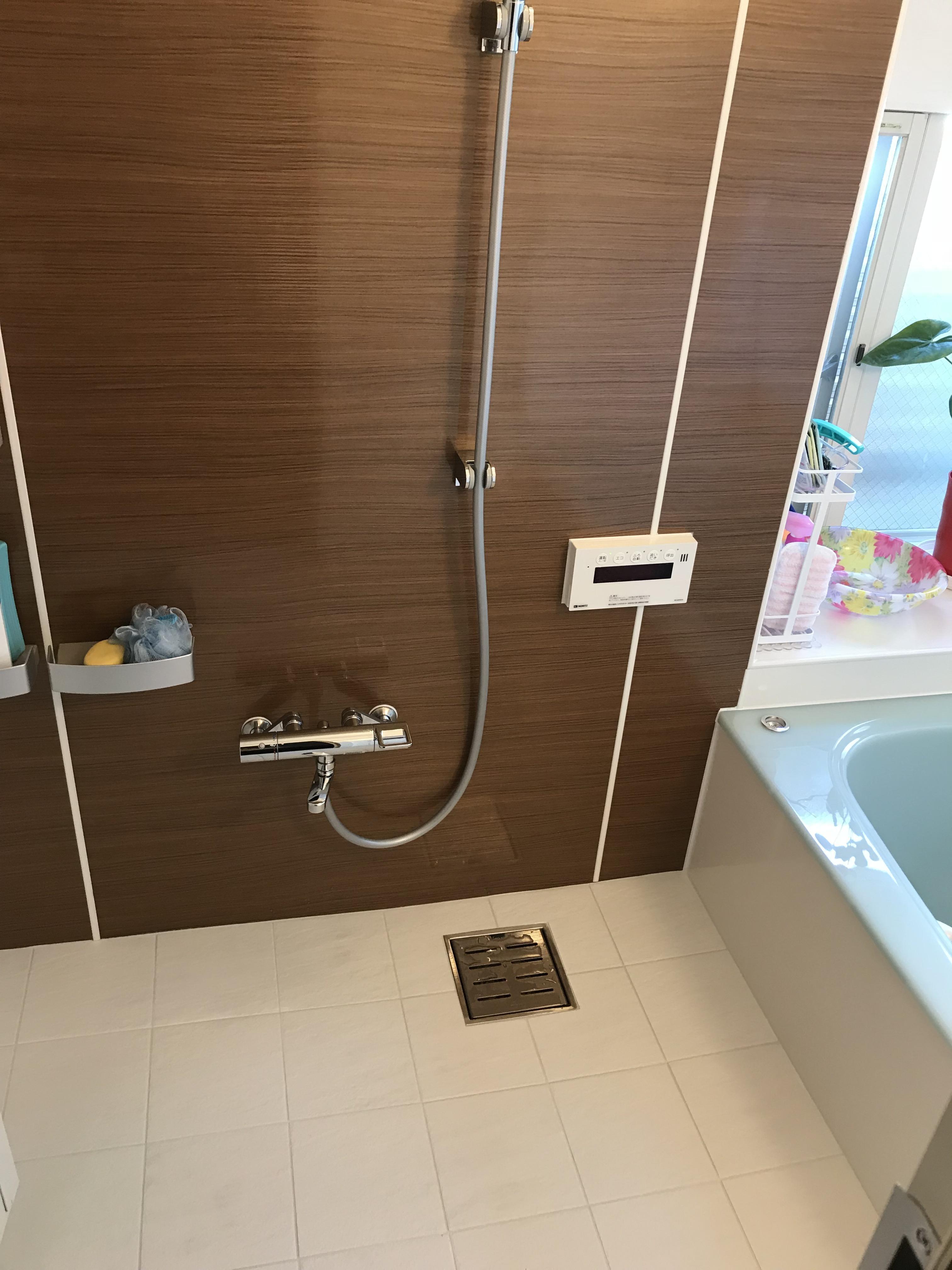 タイル在来工法のお風呂で、壁の目地や床・浴槽のお掃除も経年で大変になってきたところでした。 壁に浴室用のパネルと床はリクシルサーモタイルで段差も解消し、見た目はシステムバスのような、お手入れしやすい素敵なお風呂に なりました。