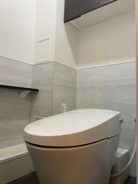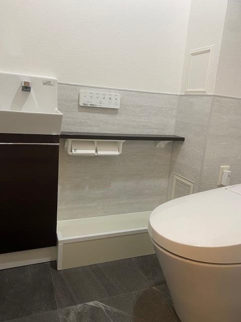 御来客が多いので、お手入れのしやすいおトイレ空間にしたいと奥様からのご要望がありました。トイレ本体はサティスS!手洗いは自動水栓コフレル。さらにお手入れしやすく壁にはパネルを貼り、床はクッションフロアーではなく長尺シートを施工させていただきました。カラーはご夫婦でご相談下さり、統一感のある素晴らしい空間になりました。