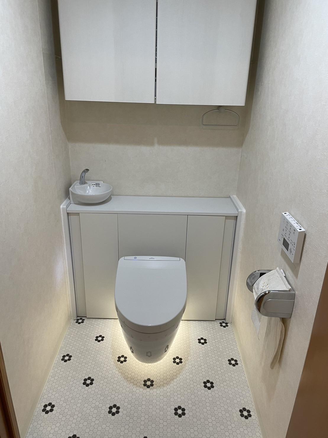 お掃除の面を大変気にされていて、色々なトイレをご検討されていらっしゃいました。数か月かけて、こちらのトイレをご選定されました。床がフラットですので、お手入れ簡単!施工後、奥様も大変気に入って喜んでくださいました。内装も奥様がこだわってご選定され、白を基調とされた明るくかわいらしい雰囲気になりました。
