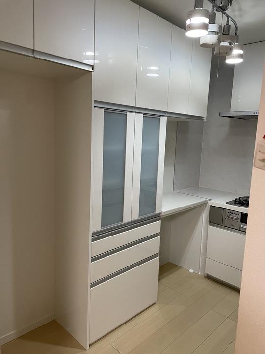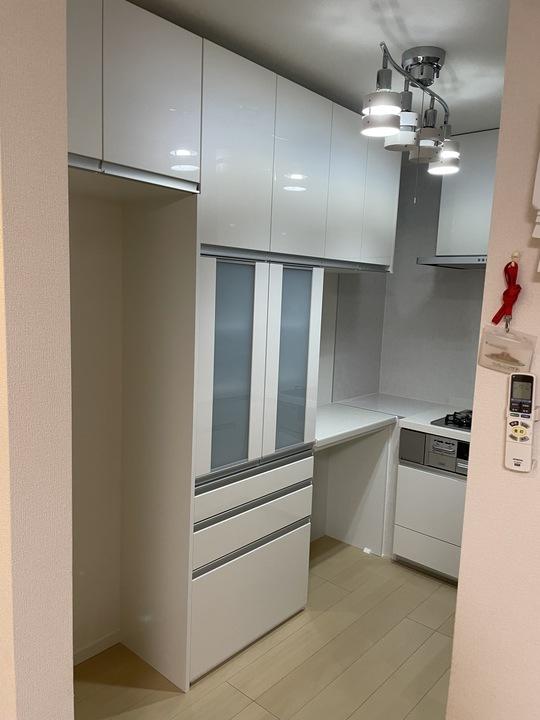 市販の食器棚から、LIXILのリシェルのカップボードにリフォーム。 収納力がアップして、さらに突っ張り棒で止める必要も無くなり見た目もキレイにすっきりしました♪