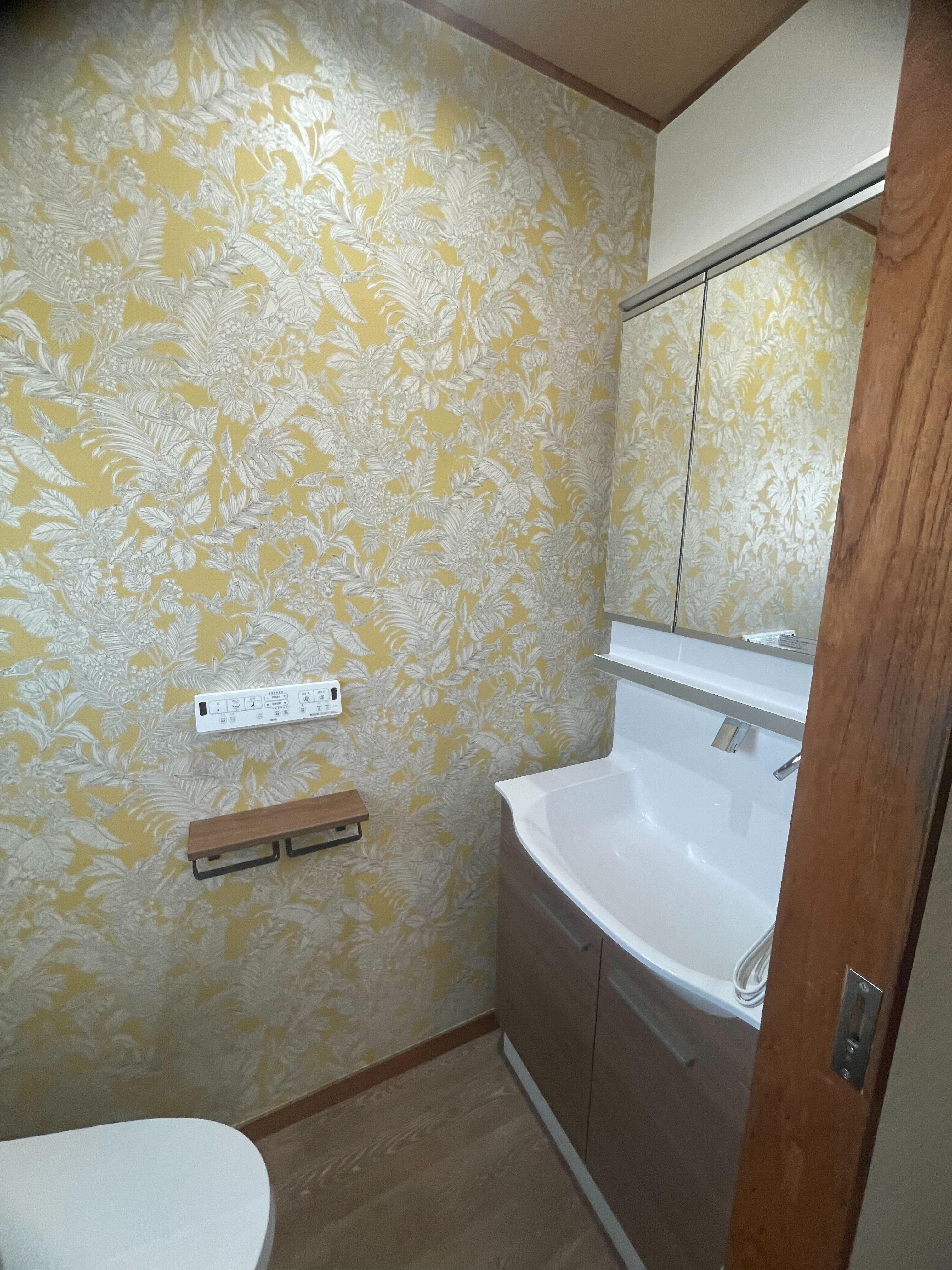 トイレ・洗面・建具を取替え、天井のダウンライト位置を変更、そして内装を娘様が選ばれたクロスに張替えました。