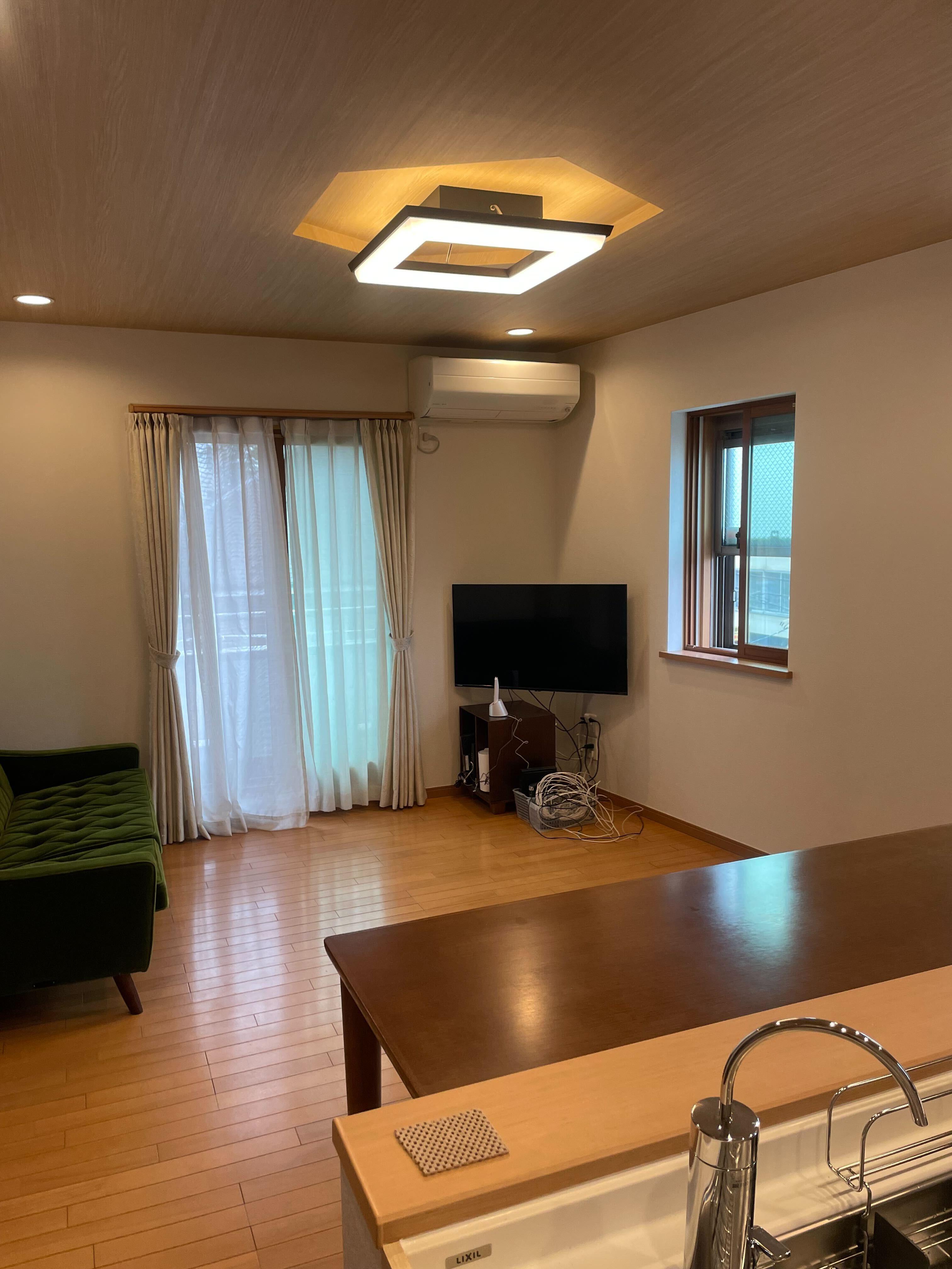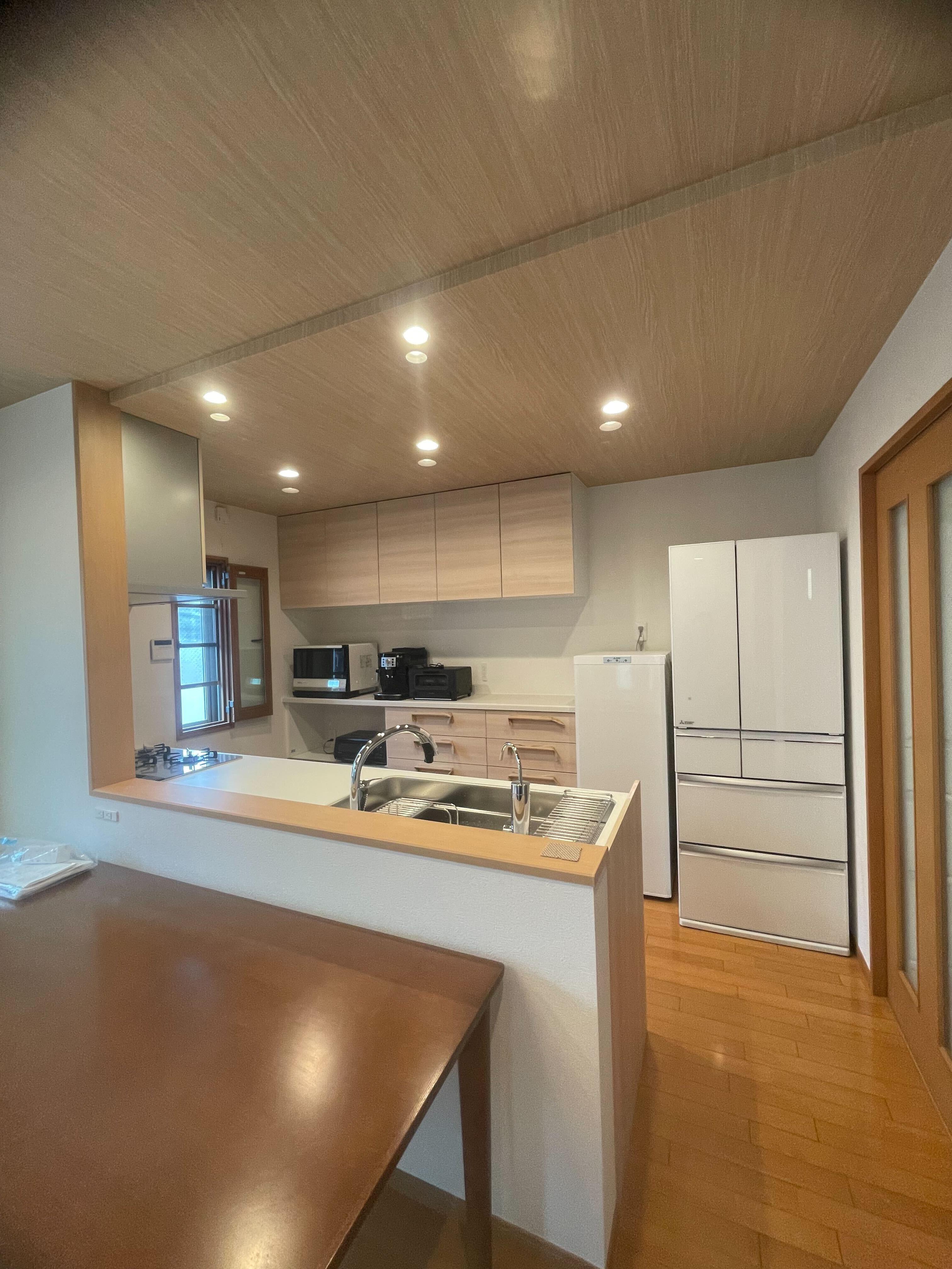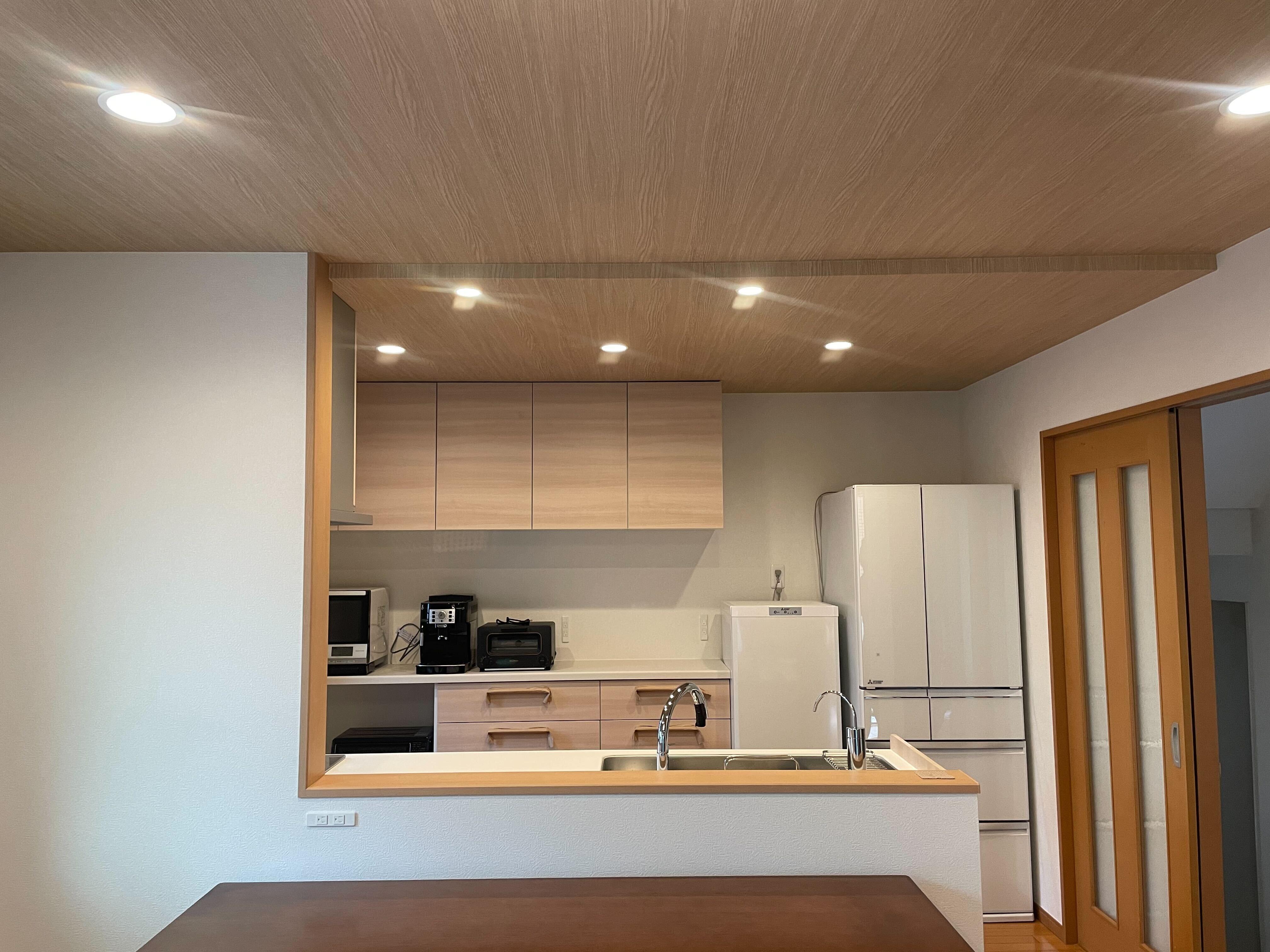 天井・リビングの壁紙も一緒に交換することで、キッチンとリビングが一続きの空間になり、より開放感がUPしています。