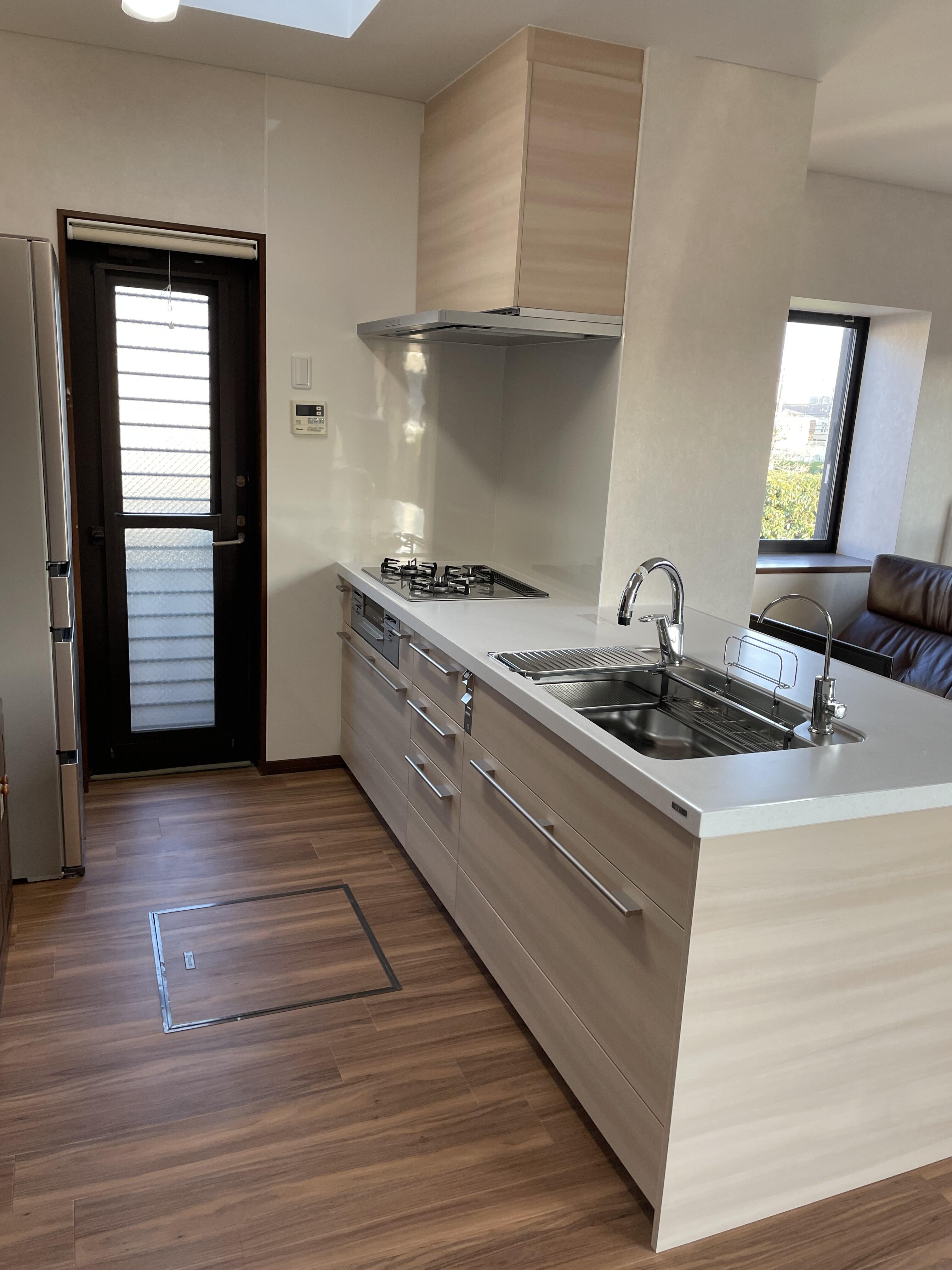 以前もご依頼いただいたお客様から、キッチンと浴室のリフォームご依頼。 明るいキッチンをご希望だったため、吊り戸と下地壁を撤去し、開放的なキッチンにリフォーム。 シンク前の壁も撤去し、フラットなカウンターへ変更しました。 以前は壁感が強かったですが、かなり開放的に。 冷暖房の効きも良くなり快適です。