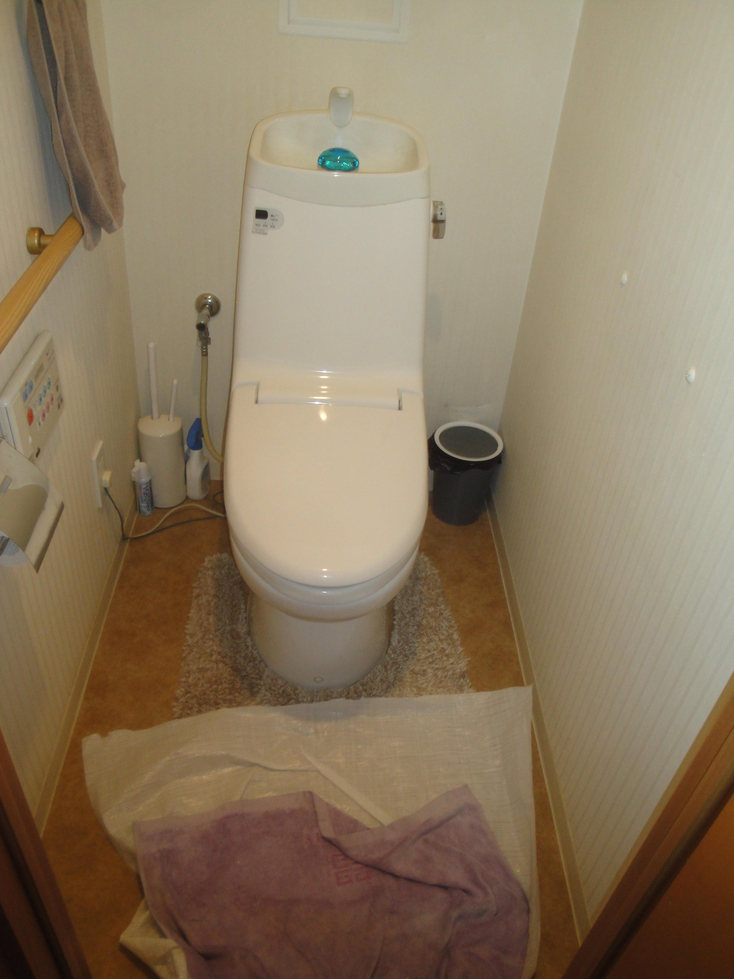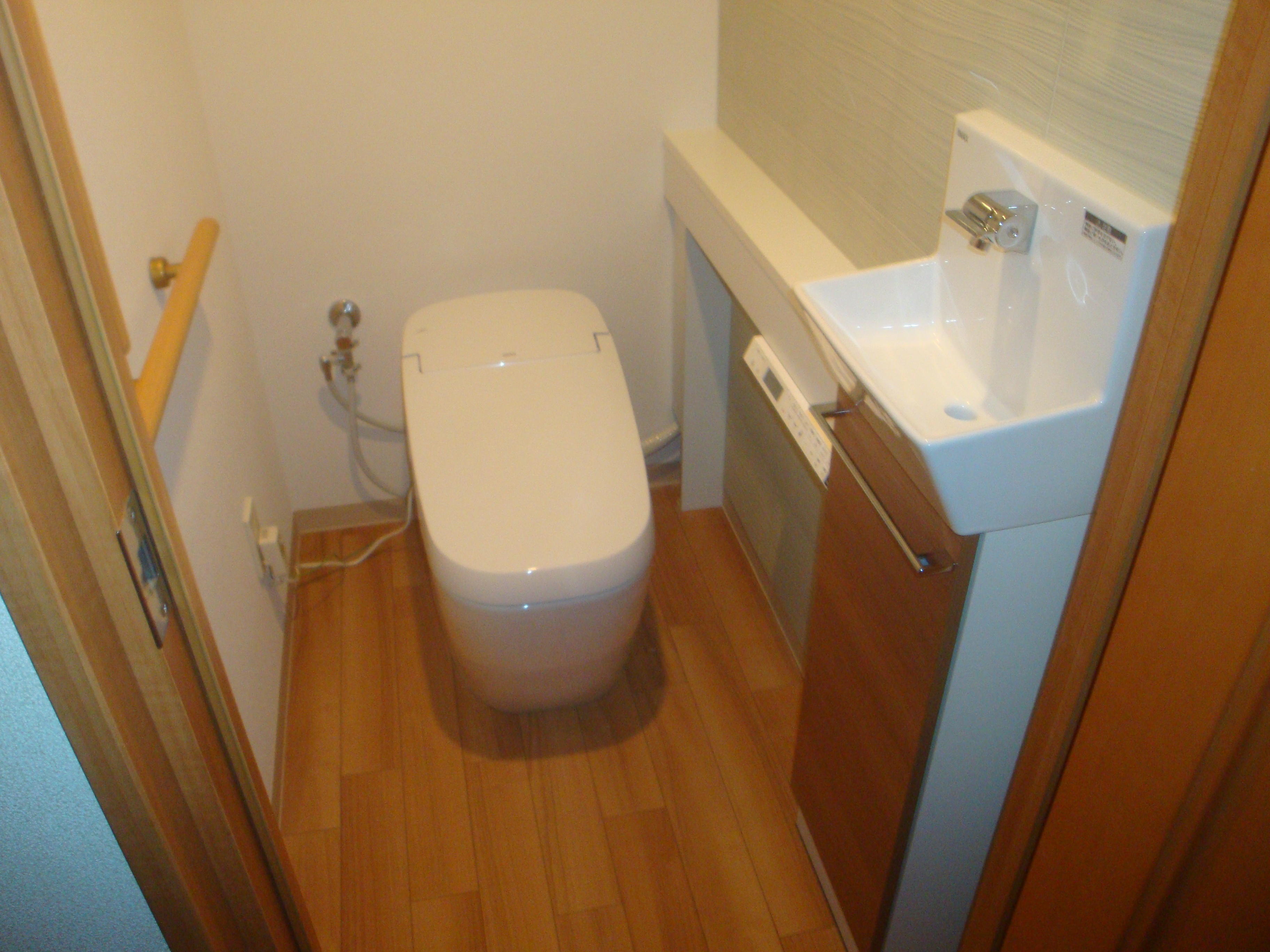 トイレ室工事 「トイレLIXILサティスGタイプ」+「エコカラットプラス」アクセントで手洗器カウンター側壁面に機能的な内装壁用タイル