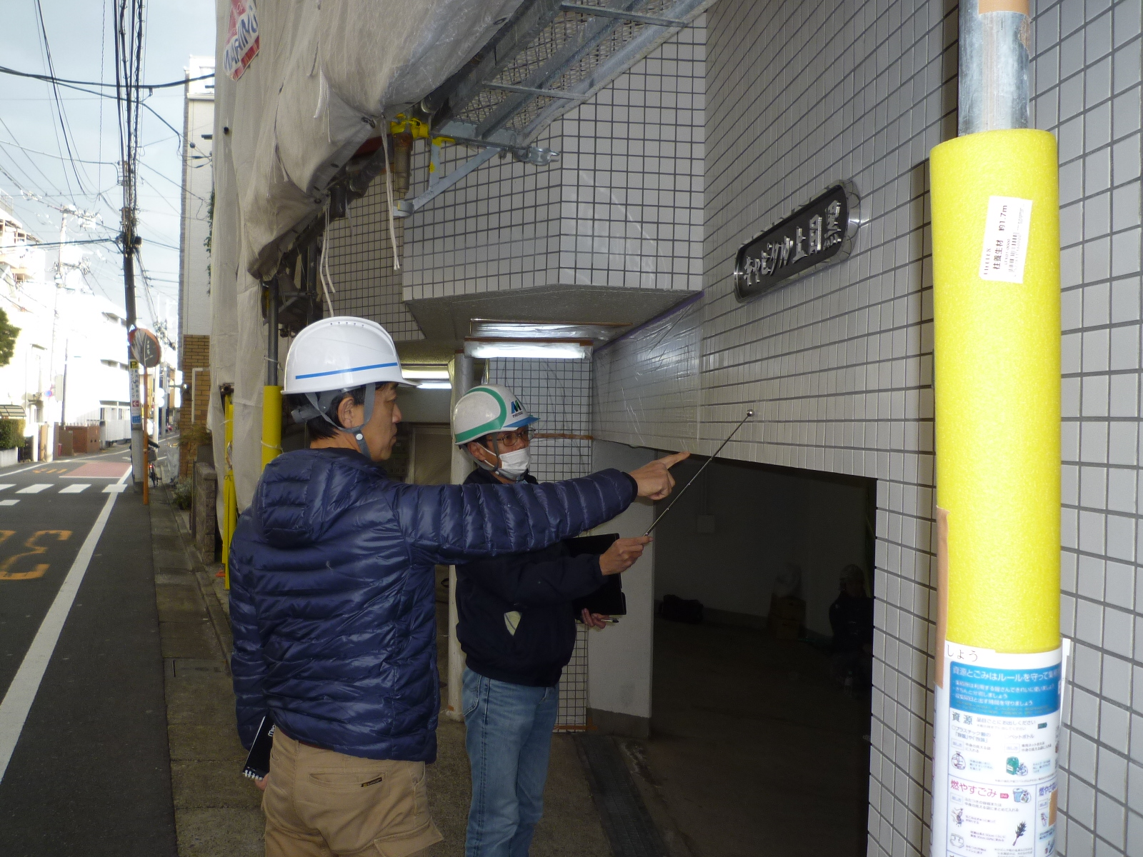 今回は外装工事がメインの現場で塗装工事の職長さんと当社鈴木が中間検査を実施しています。