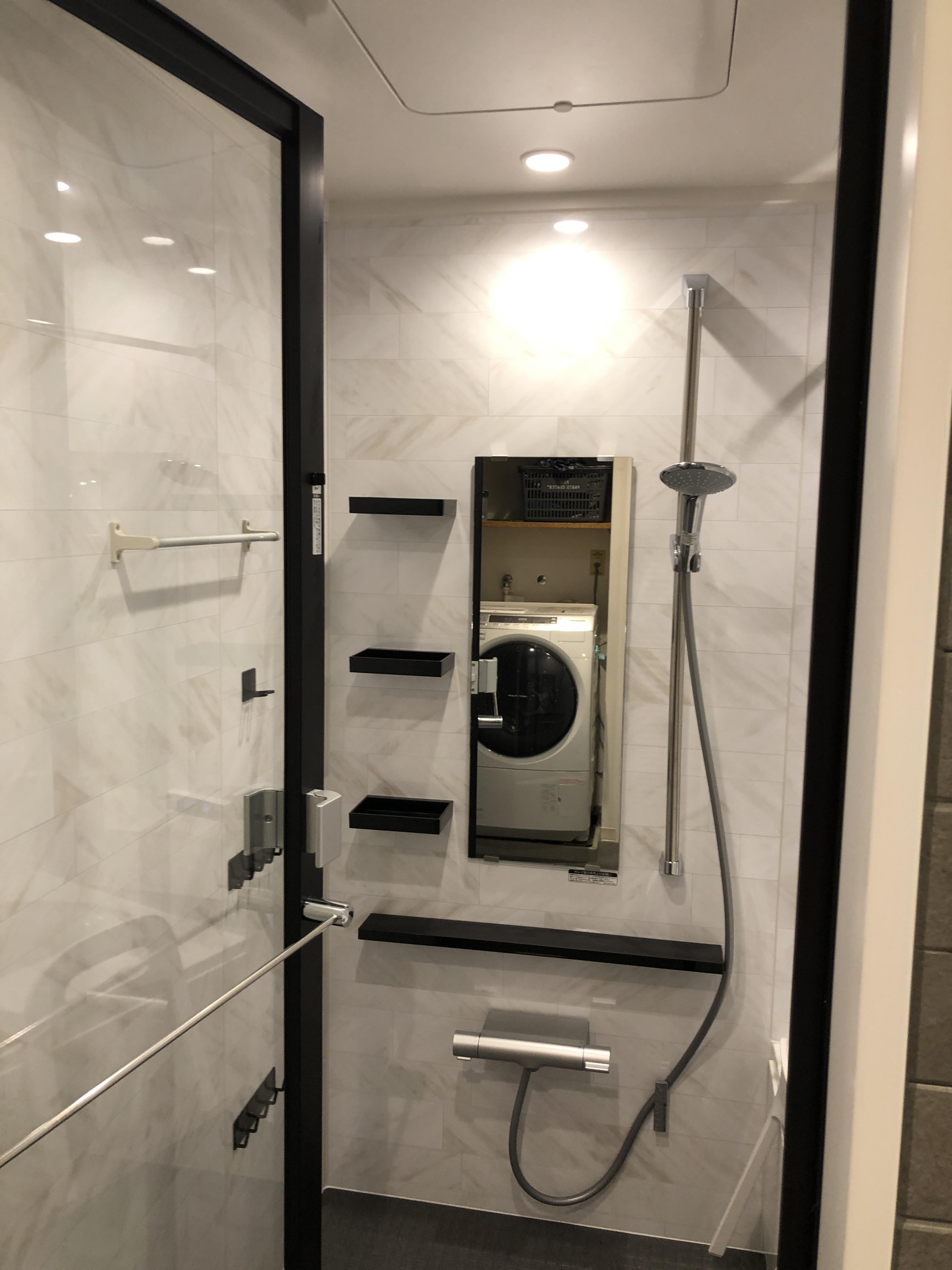 白を基調とした浴室に対し収納やドアを黒で統一することで高級感のある仕上がりになりました!